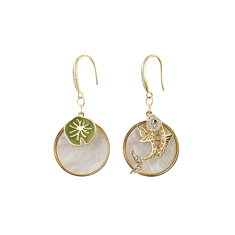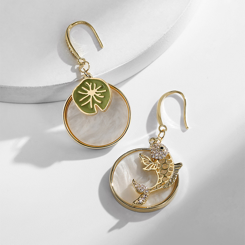 国风新款创意不对称荷叶鲤鱼耳环圆形耳坠气质小众女耳钩厂价批发