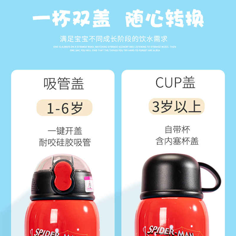 迪士尼儿童吸管保温杯漫威蜘蛛侠两用男女学生水壶316双盖带杯套