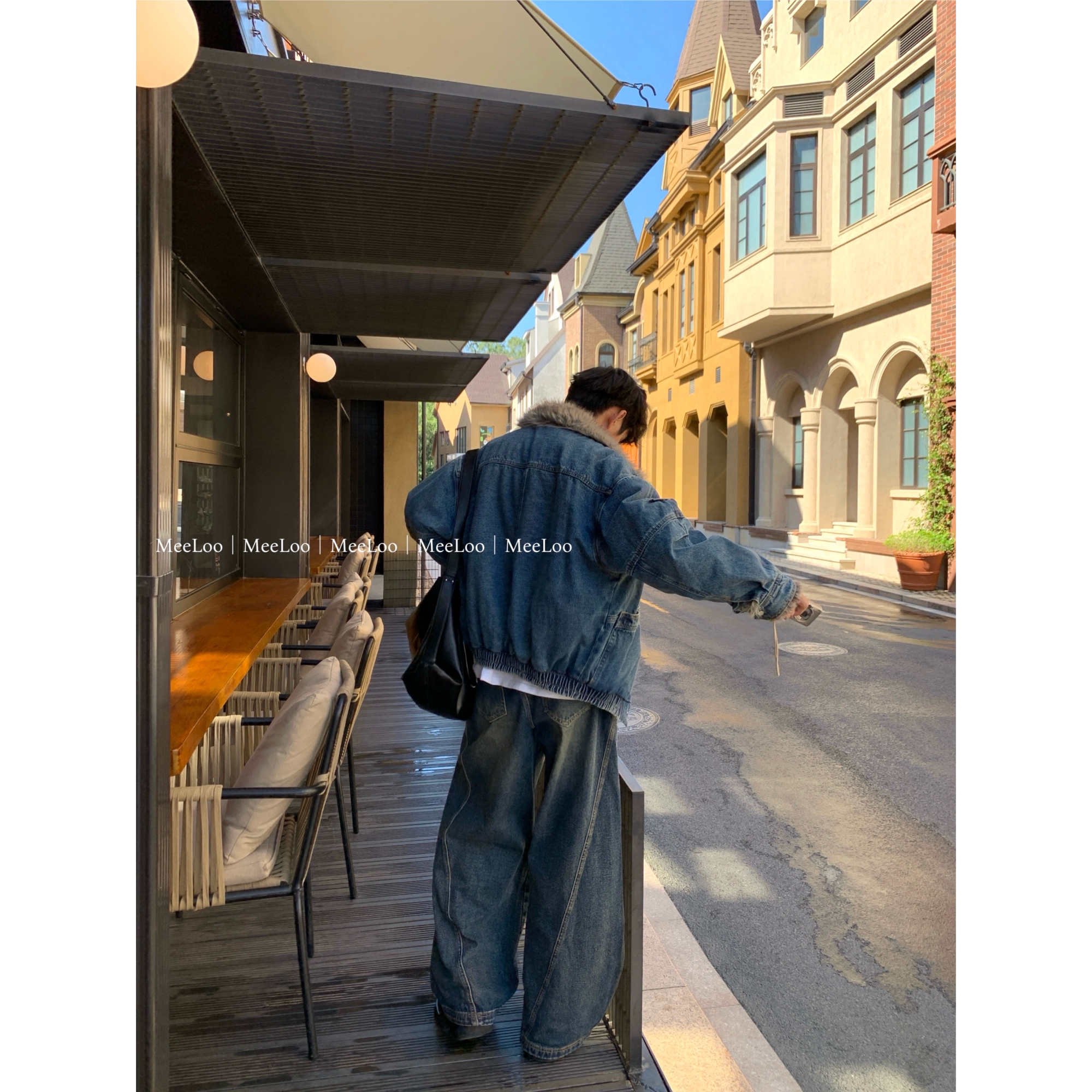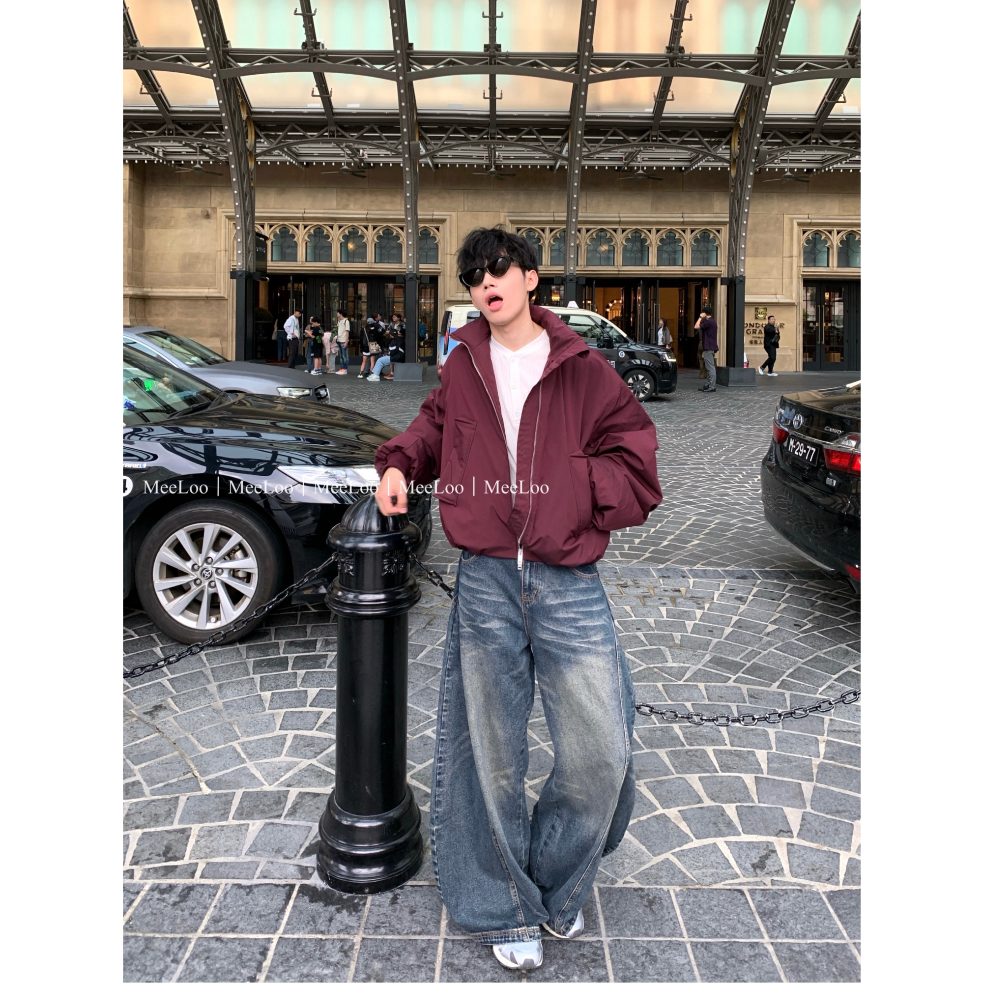 MeeLoo猫须美式风宽松牛仔裤男复古水洗弯刀裤拖地阔腿显瘦直筒裤