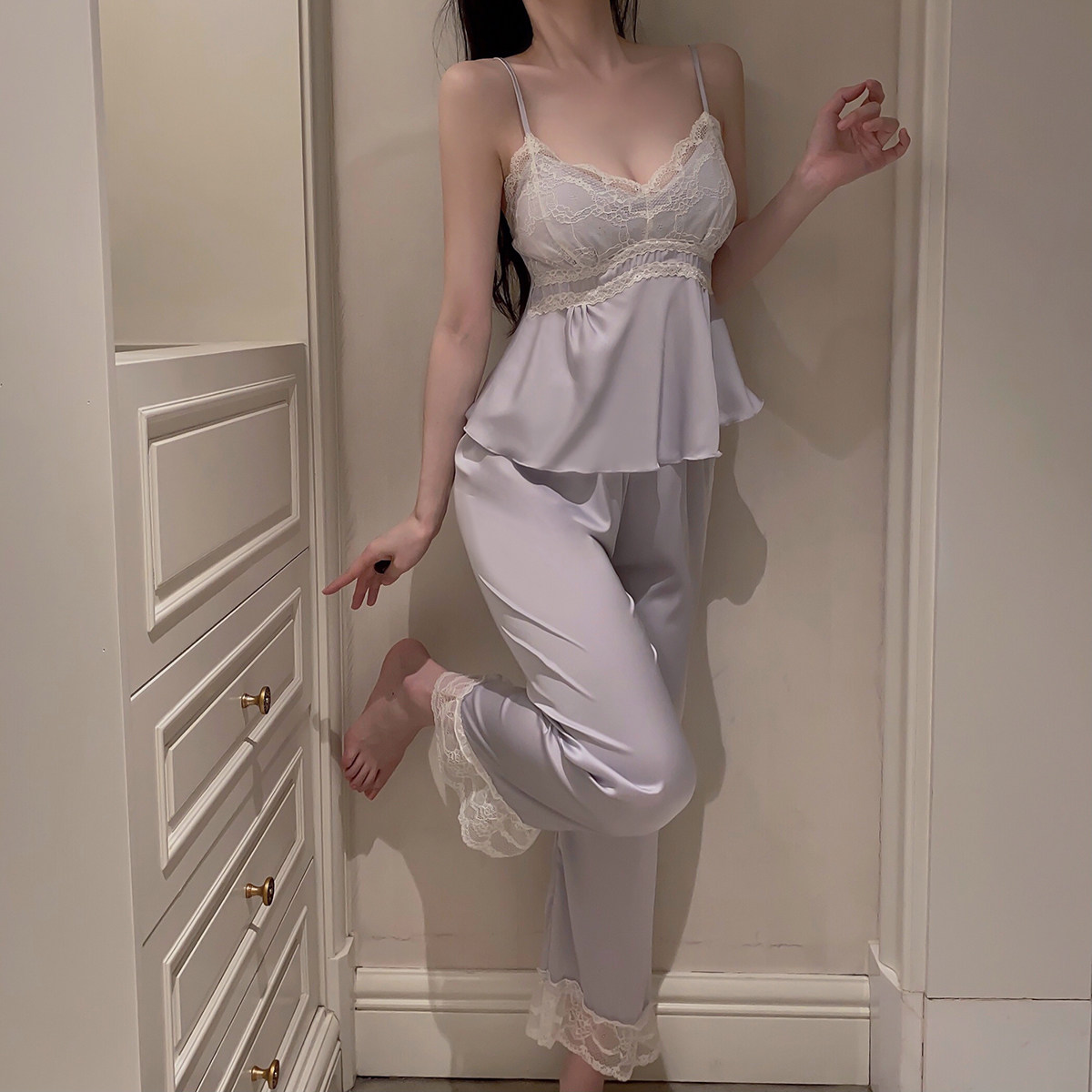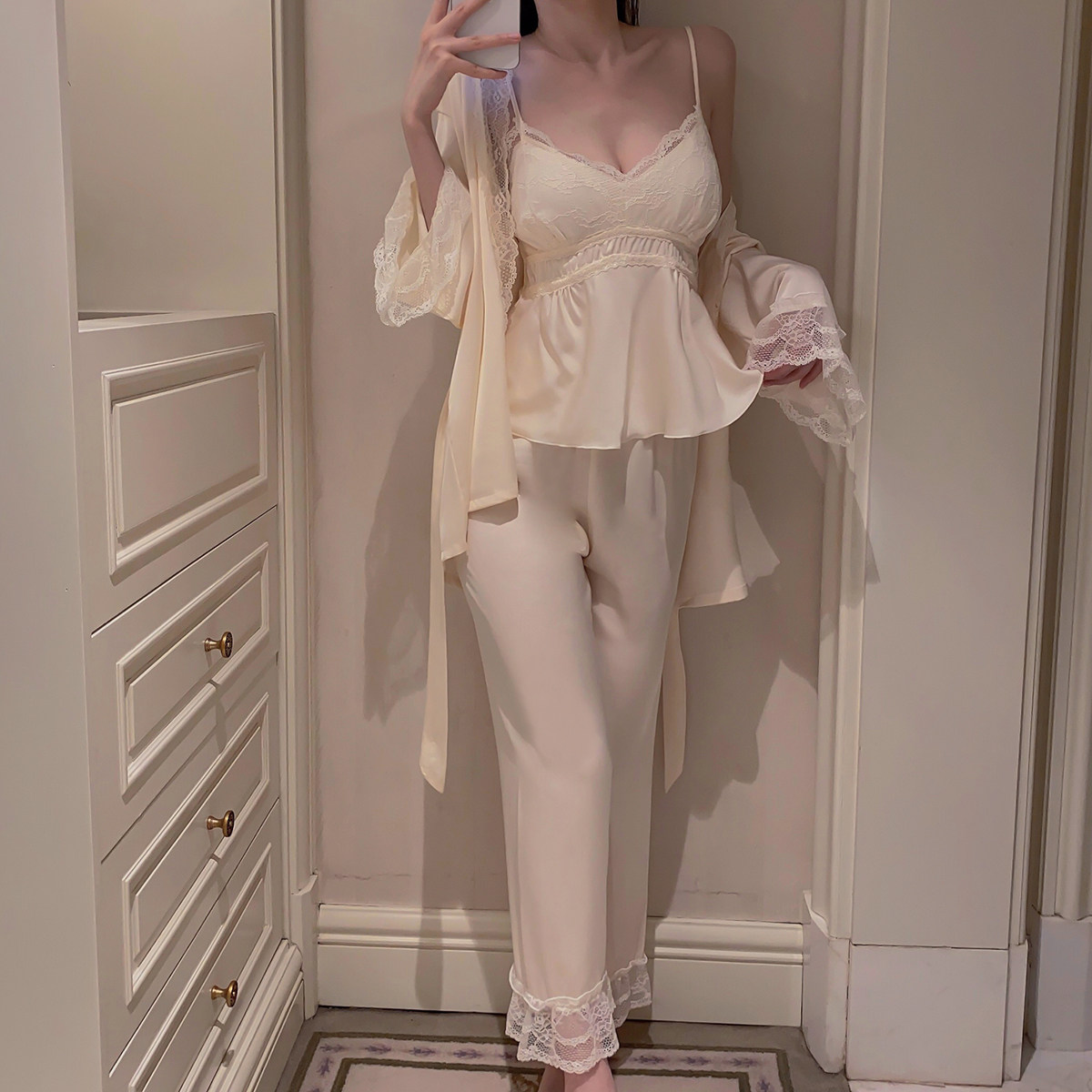 睡衣女冰丝缎面三件套装法式春夏秋季吊带胸垫新款法式蕾丝家居服