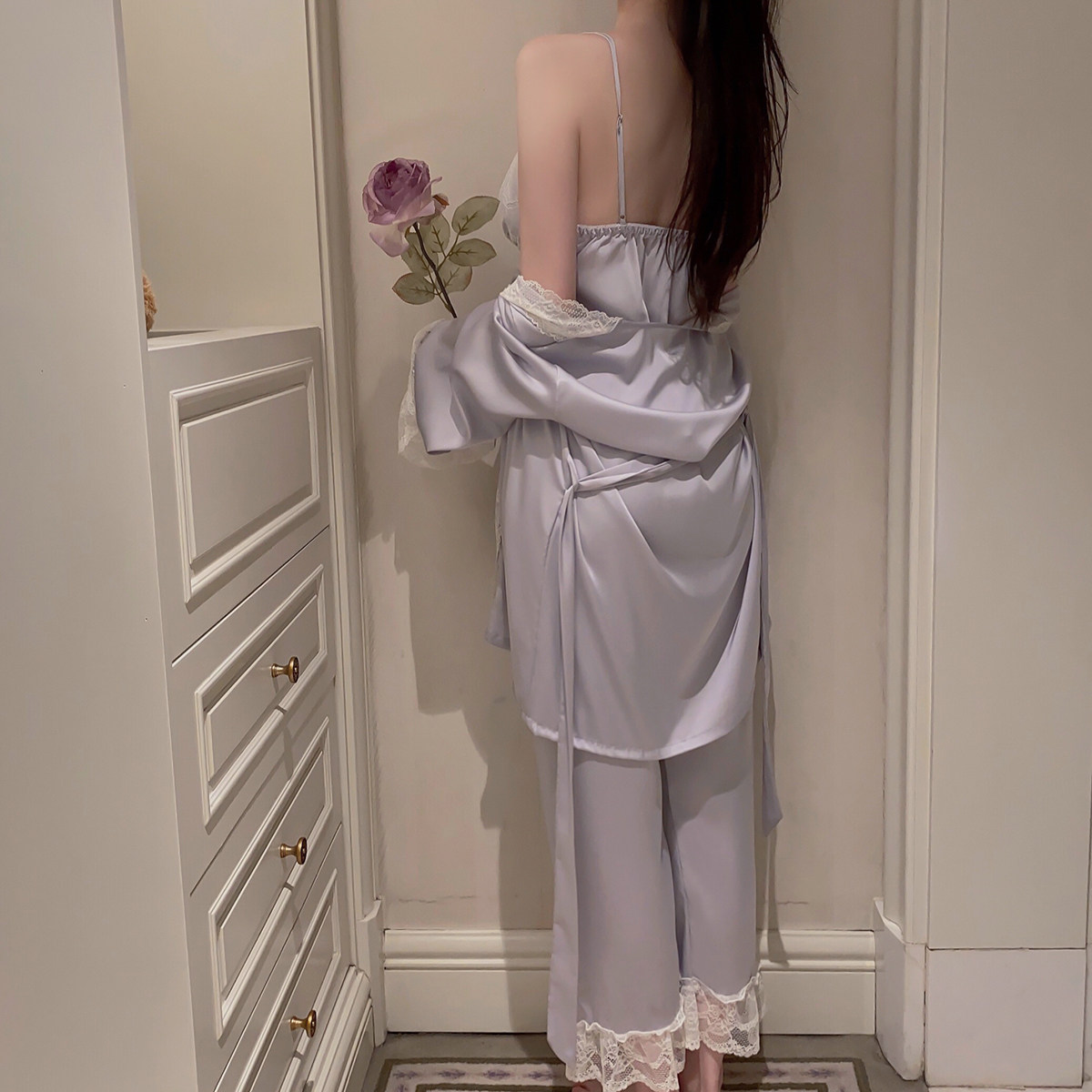 睡衣女冰丝缎面三件套装