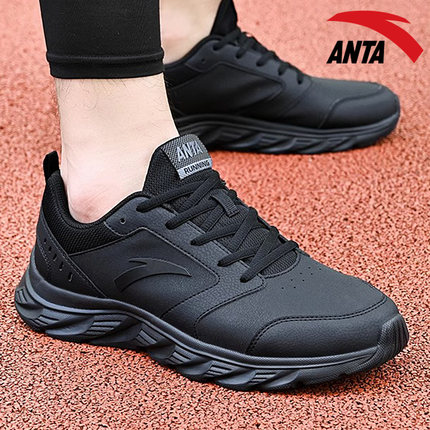 安踏防水运动鞋男鞋黑色皮面跑鞋