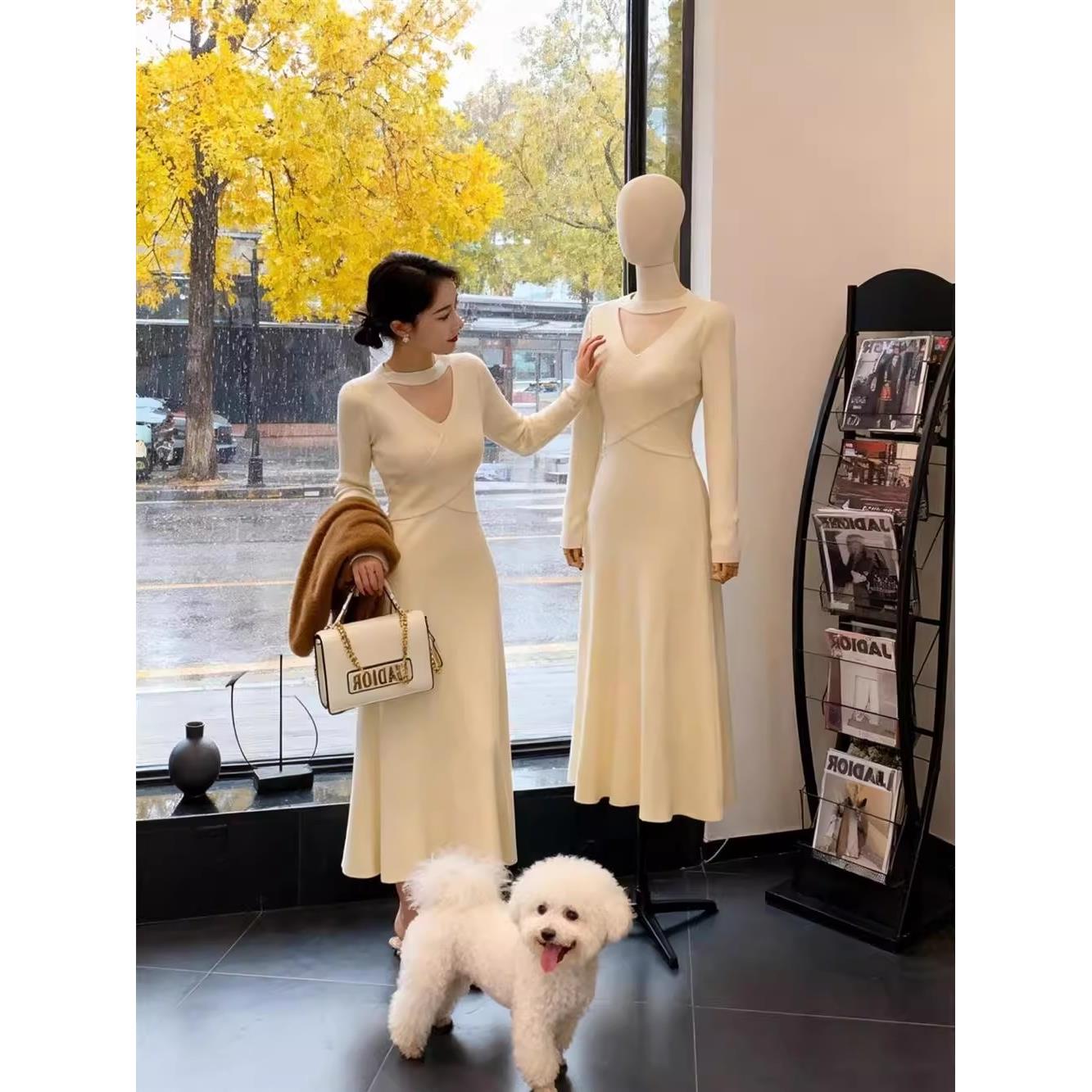 法式长袖针织连衣裙女2025秋冬中长款气质修身显瘦高级感中长裙子