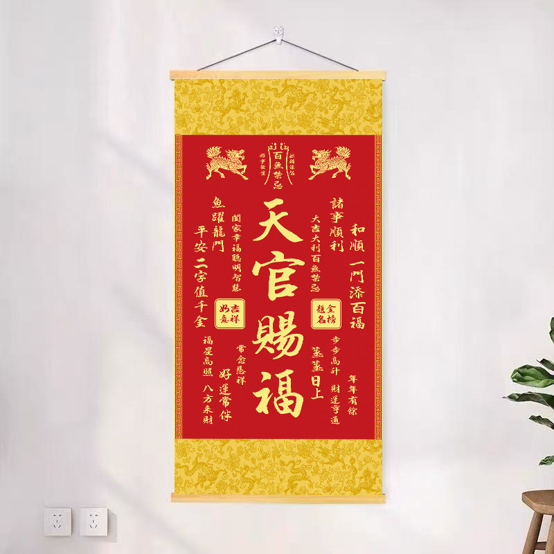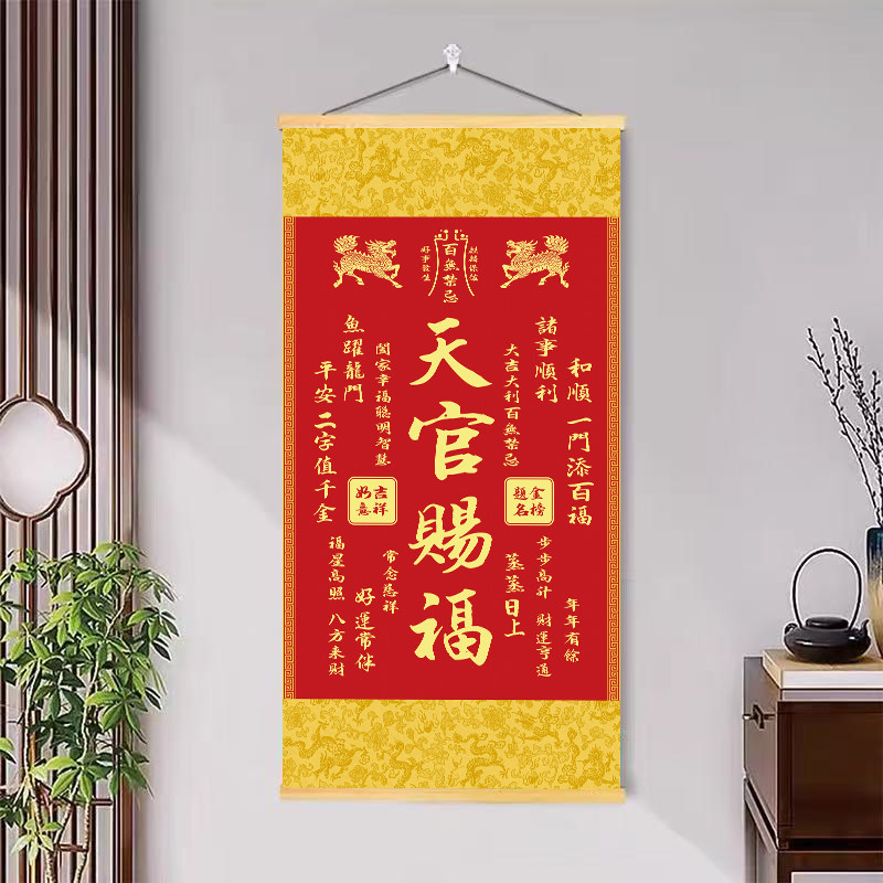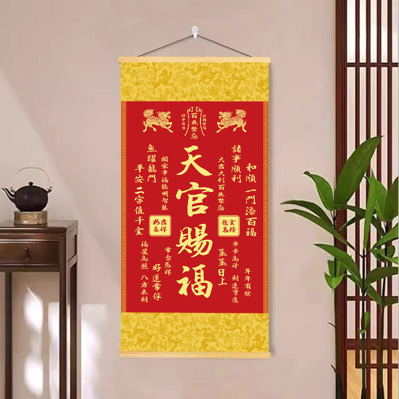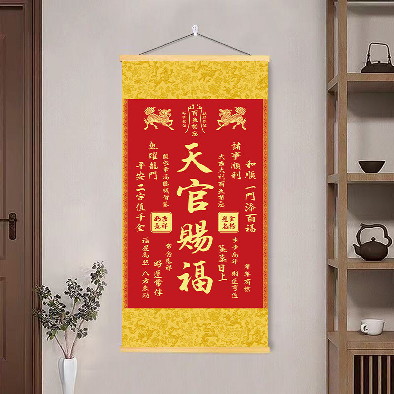 新款麒麟天官赐福挂画客厅书房卧室入户玄关实木卷轴正品装饰画