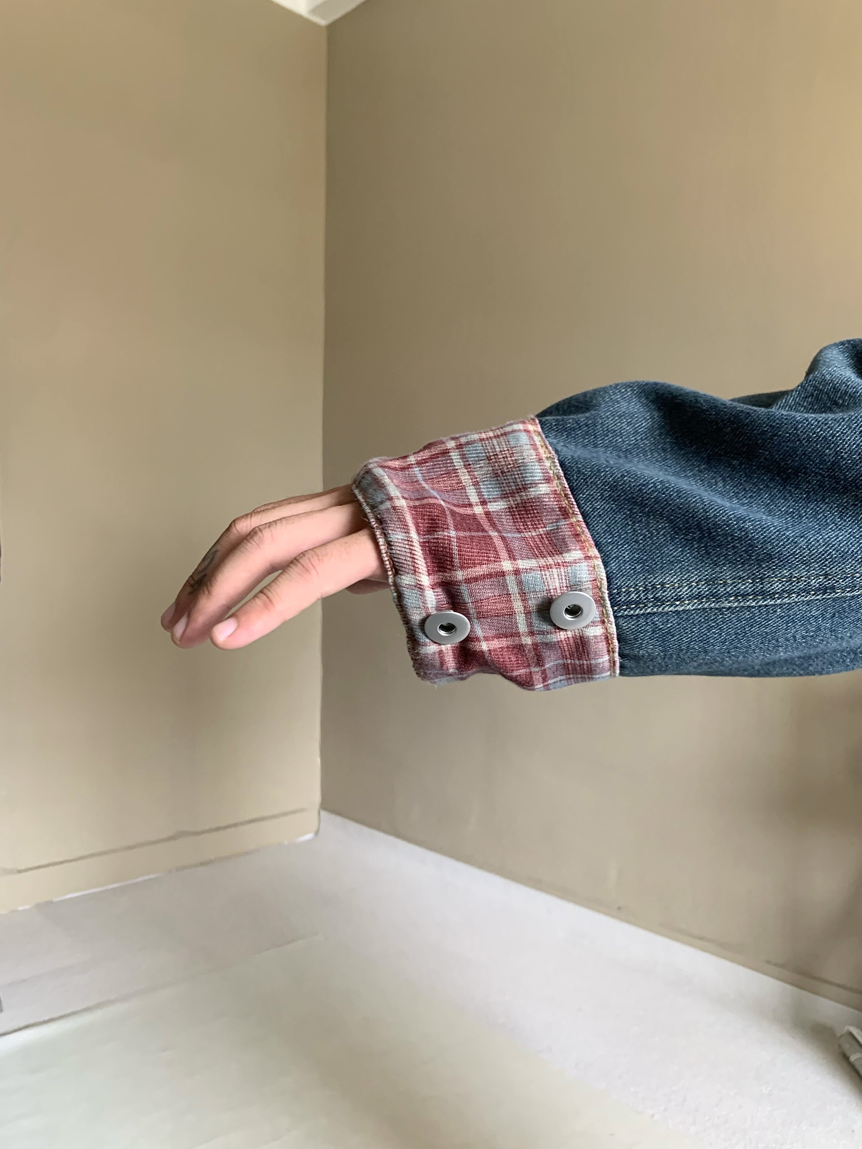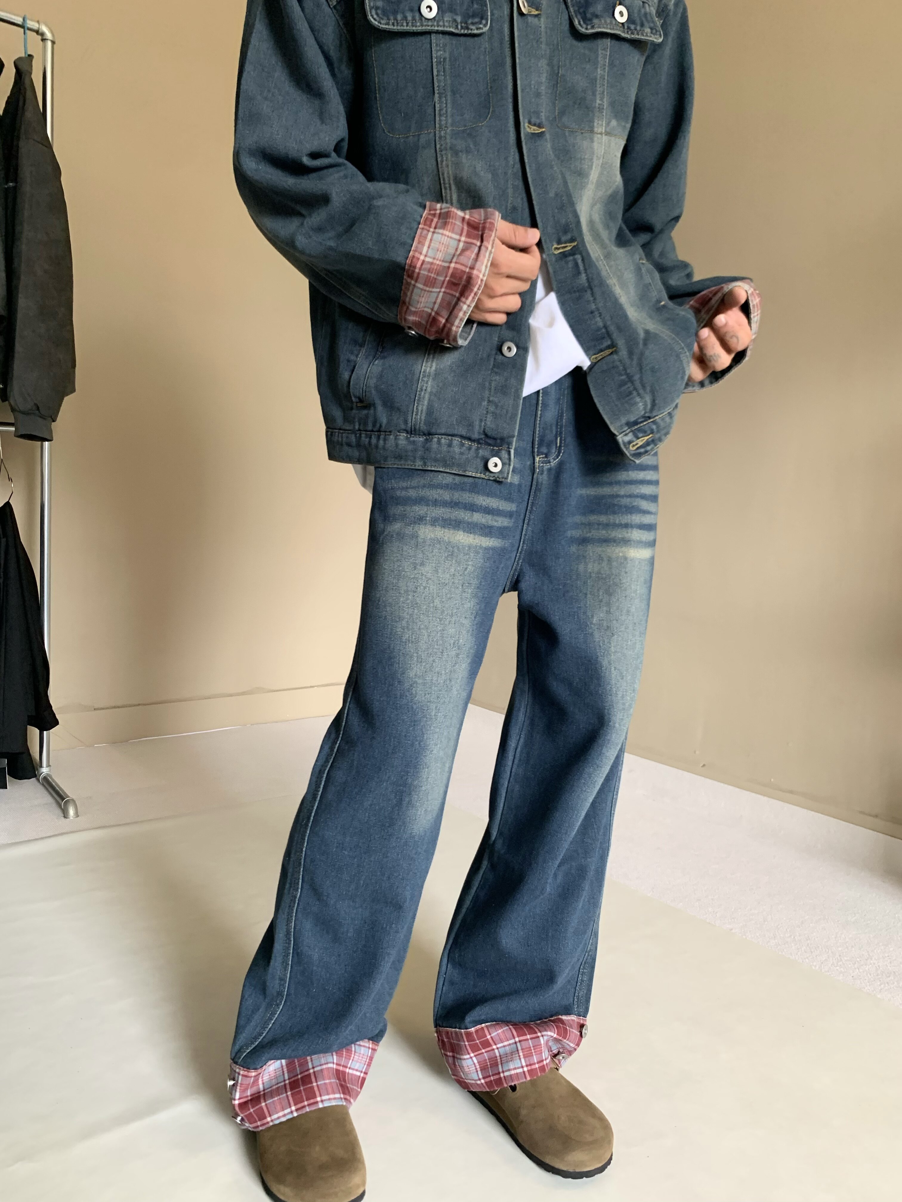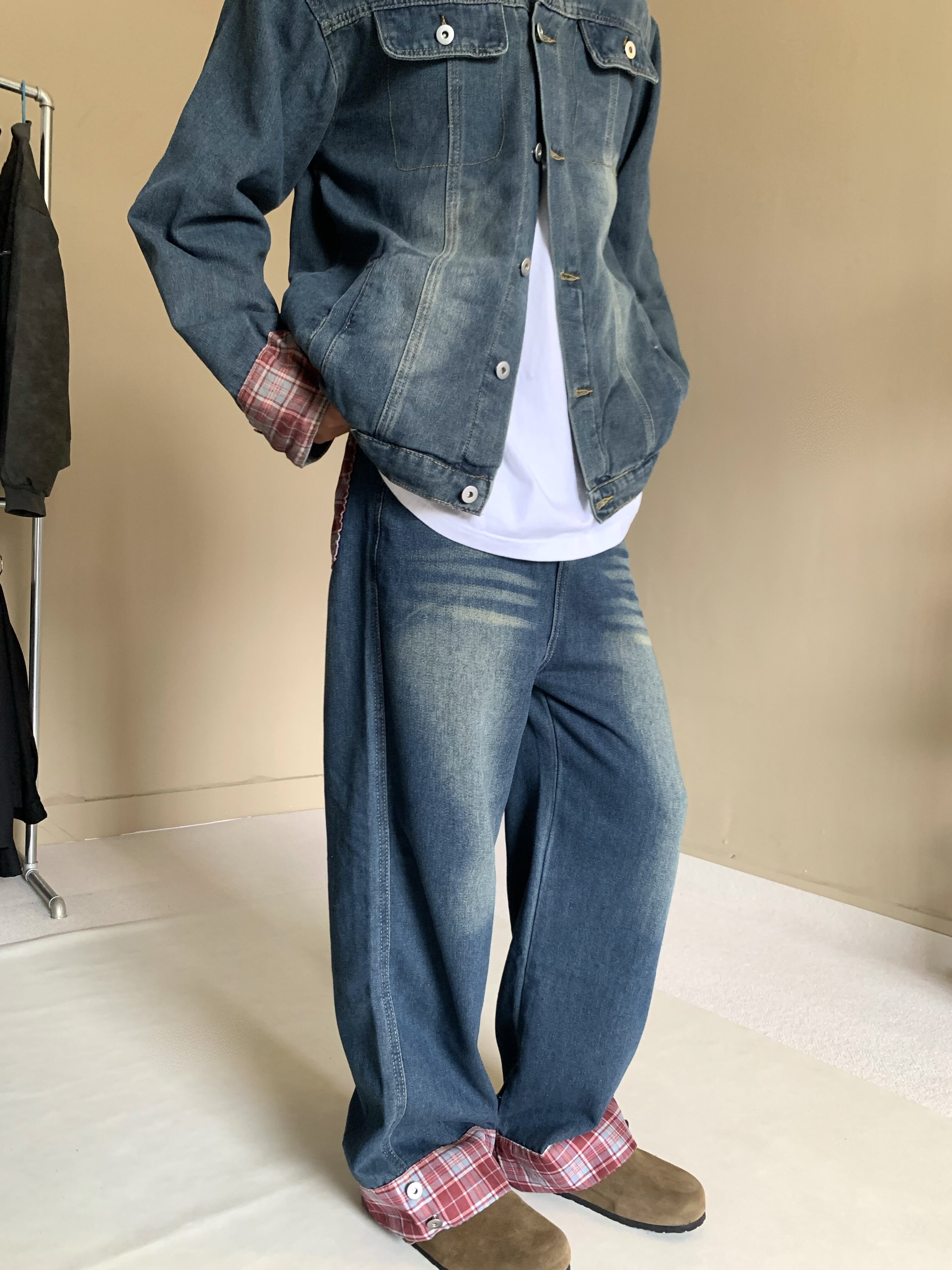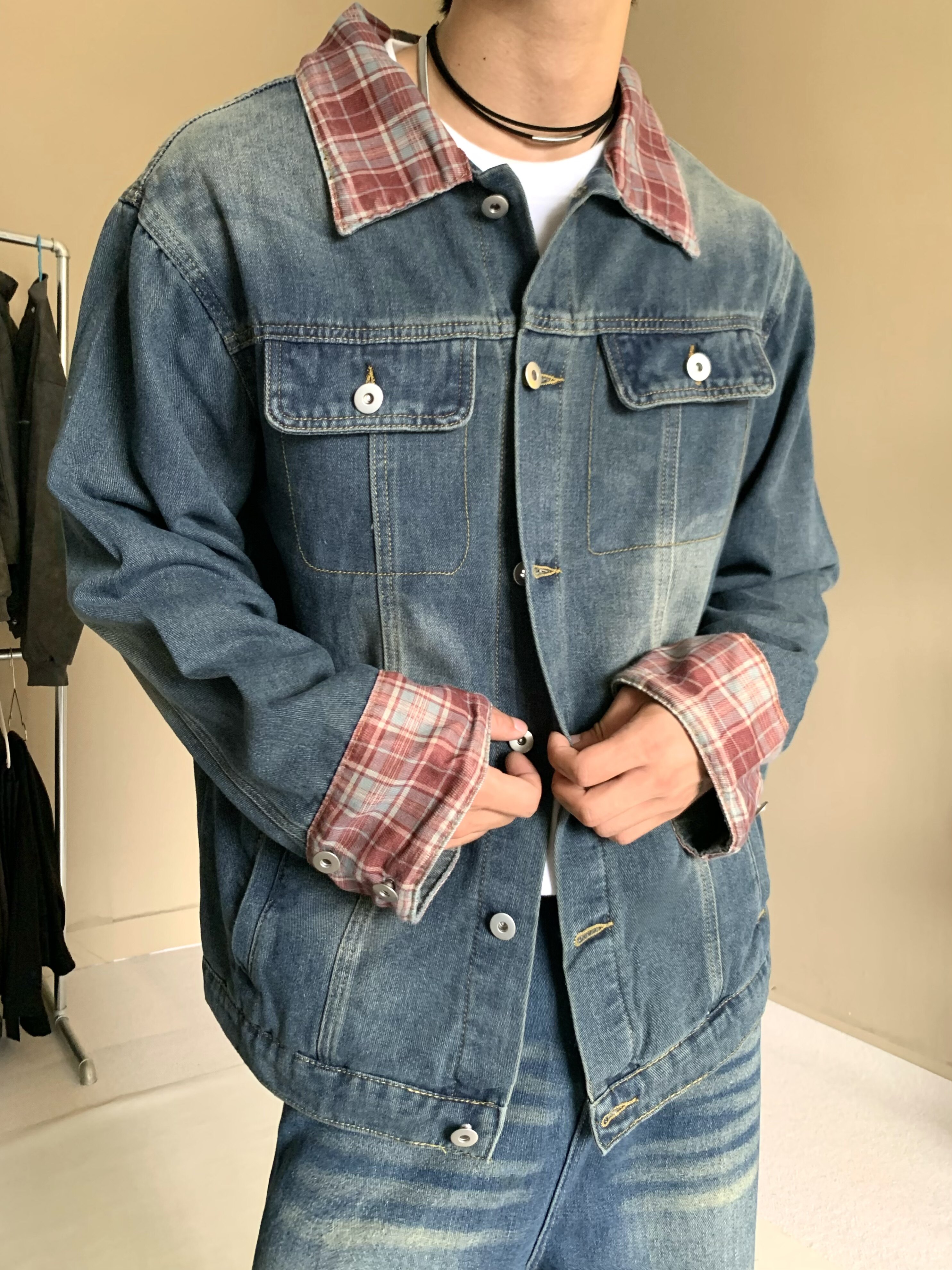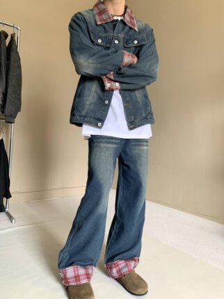 美式格纹设计感翻领复古蓝色牛仔外套男女宽松水洗做旧夹克痞帅潮