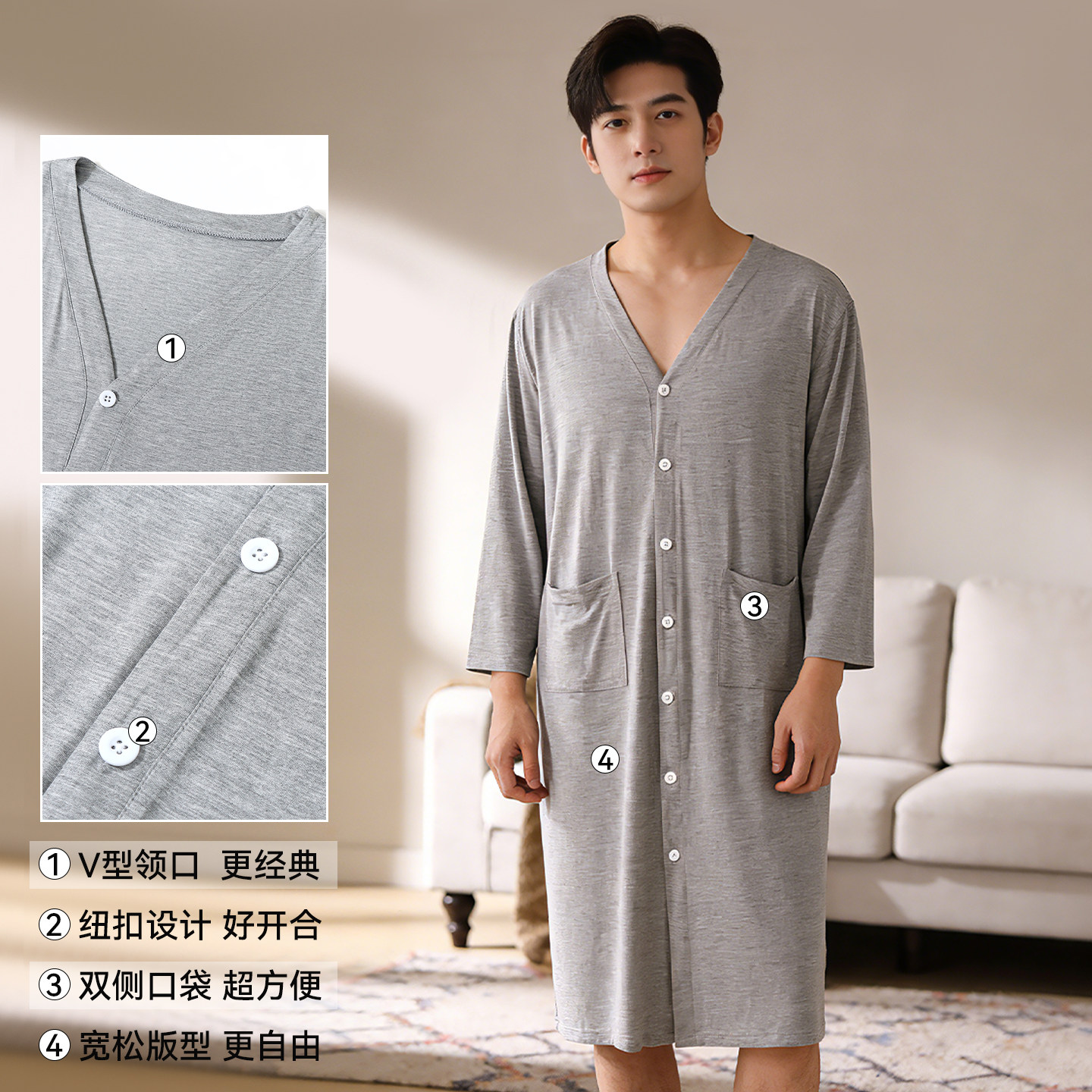 男士睡袍莫代尔裸睡家居服浴袍薄款春夏秋可外穿开衫宽松大码睡裙