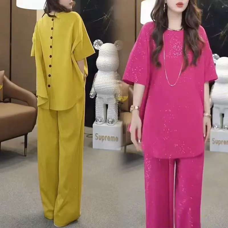 夏日多巴胺一整套亮片运动服套装女显瘦大码胖mm阔腿裤休闲两件套