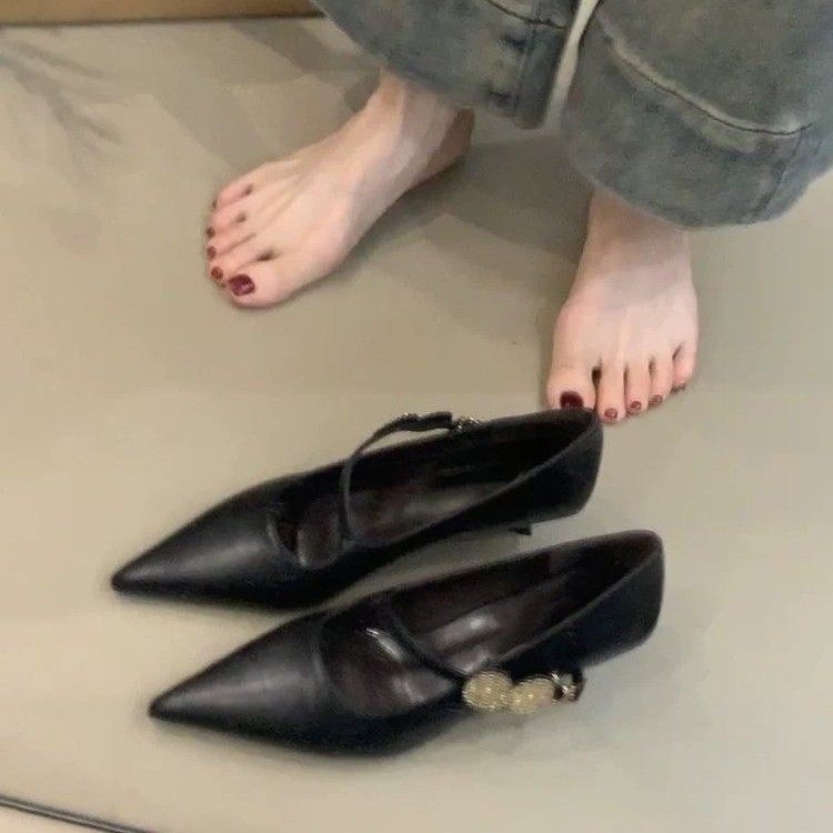 羊皮版~法式复古尖头气质金属扣一字带高跟鞋浅口低跟通勤单鞋女