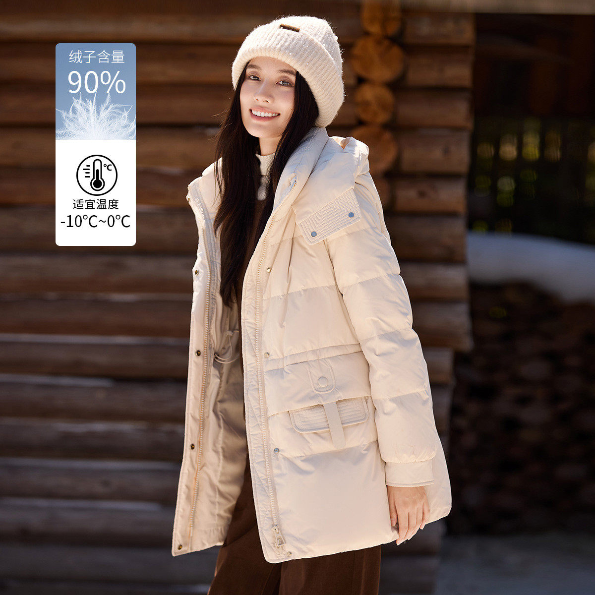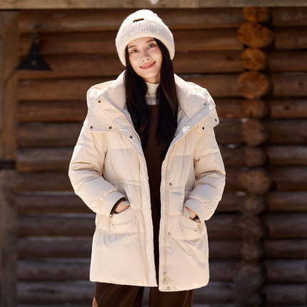 茵曼2025冬季新款长袖中长款鸭绒羽绒服女上衣宽松连帽外套面包服