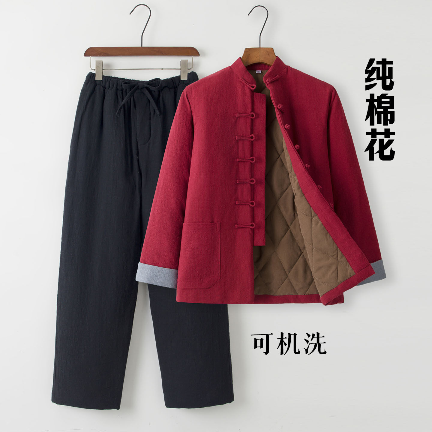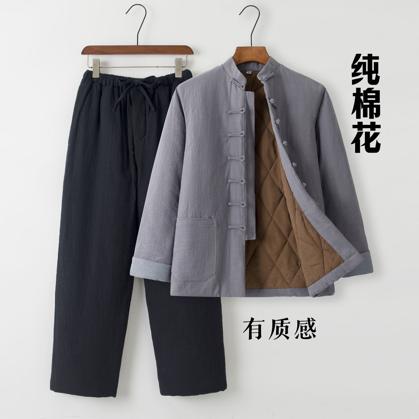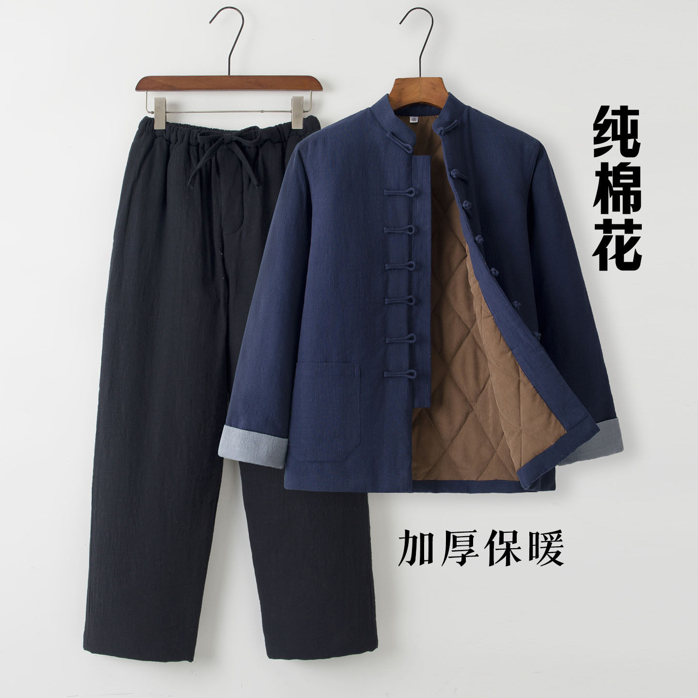 男士冬季加厚保暖中式亚麻中国风唐装男棉花棉袄复古盘扣棉衣外套