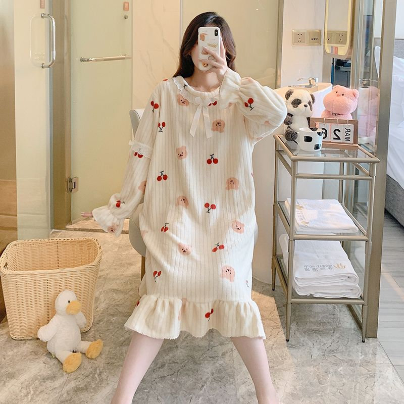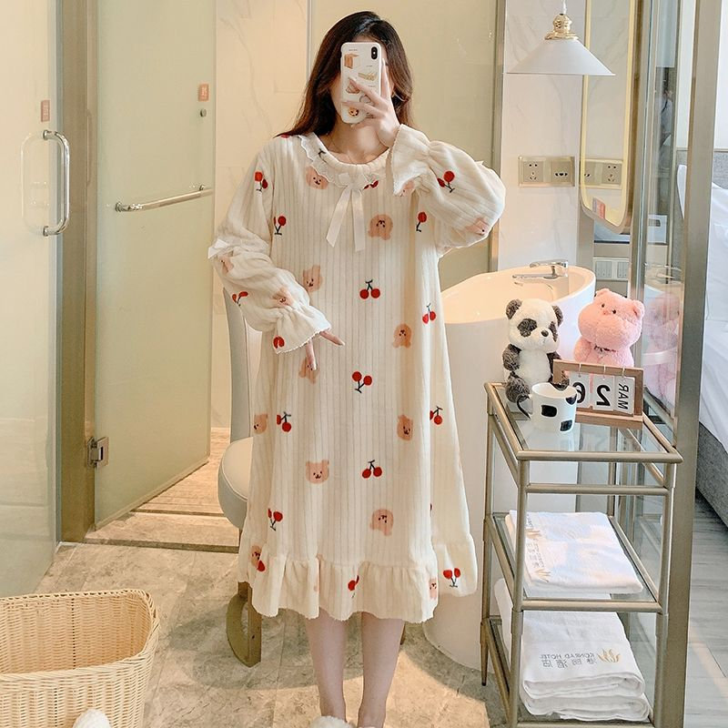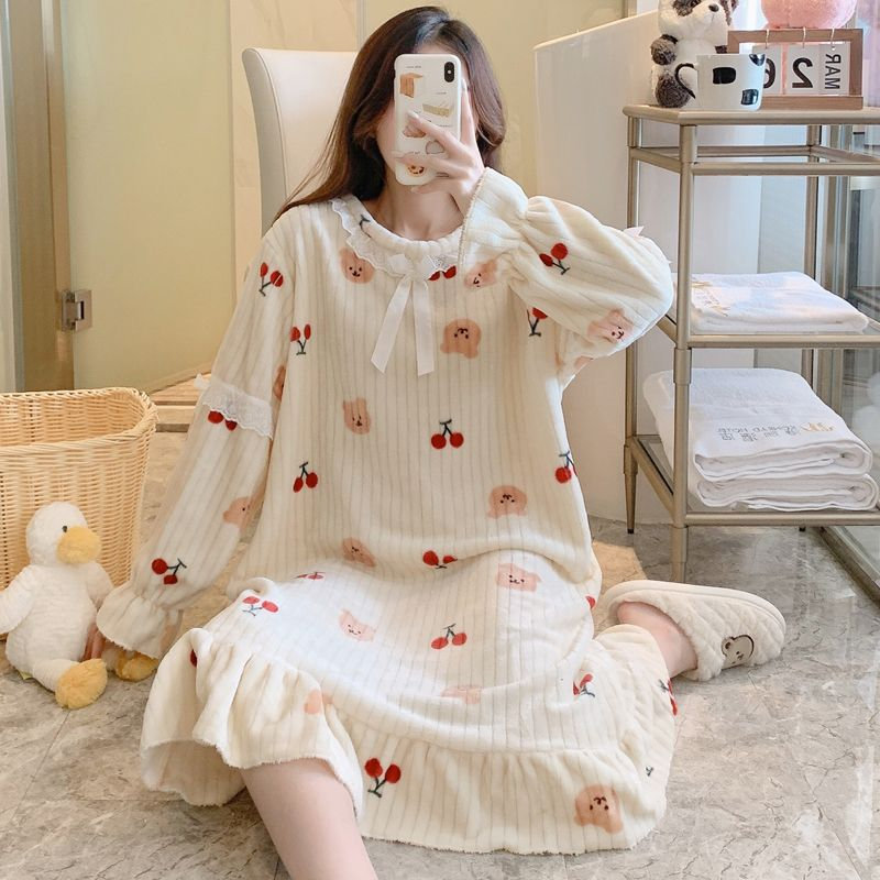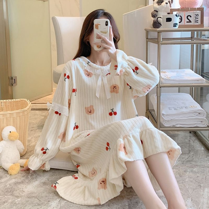 法兰绒睡衣女秋冬季绒珊瑚绒睡裙