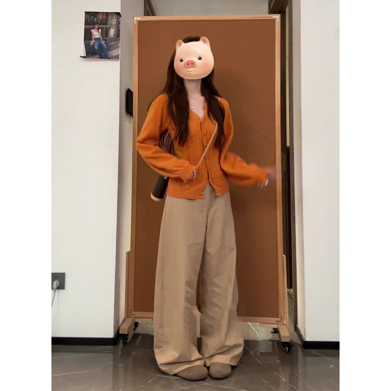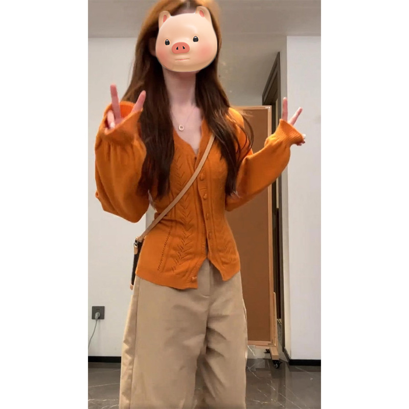 橘色V领麻花毛衣开衫女早秋韩系穿搭小个子修身短款针织外套上衣