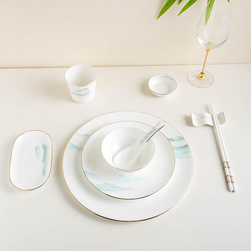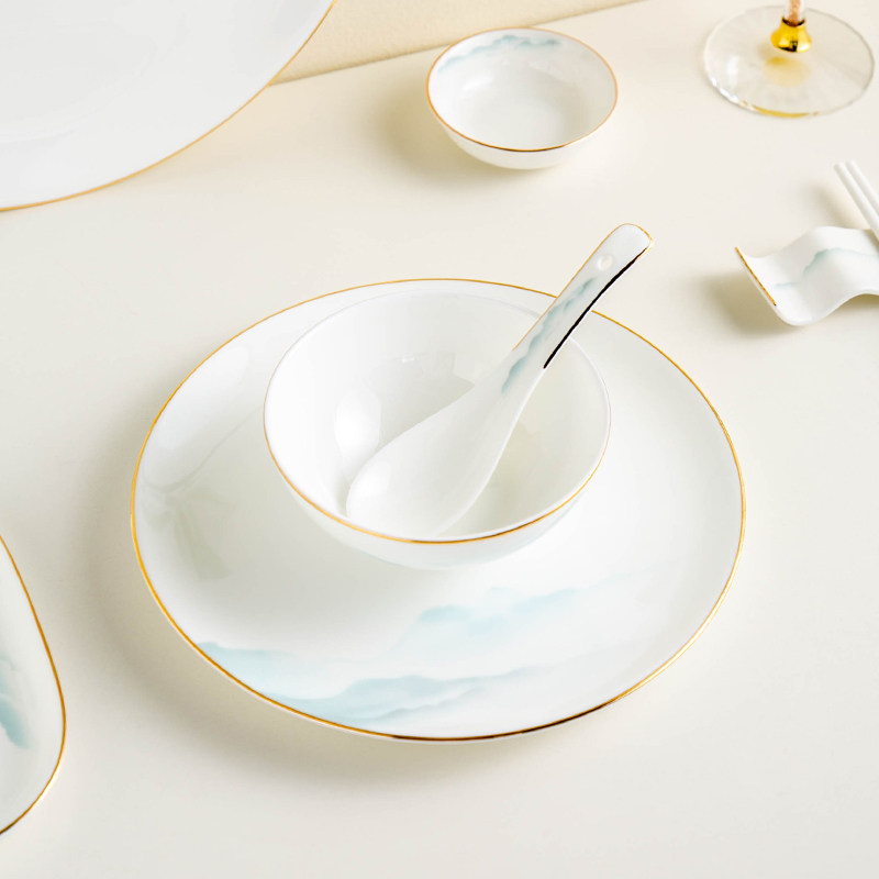 中式山水金边骨瓷摆台八件套餐具套装样板间酒店包厢碗盘定制logo