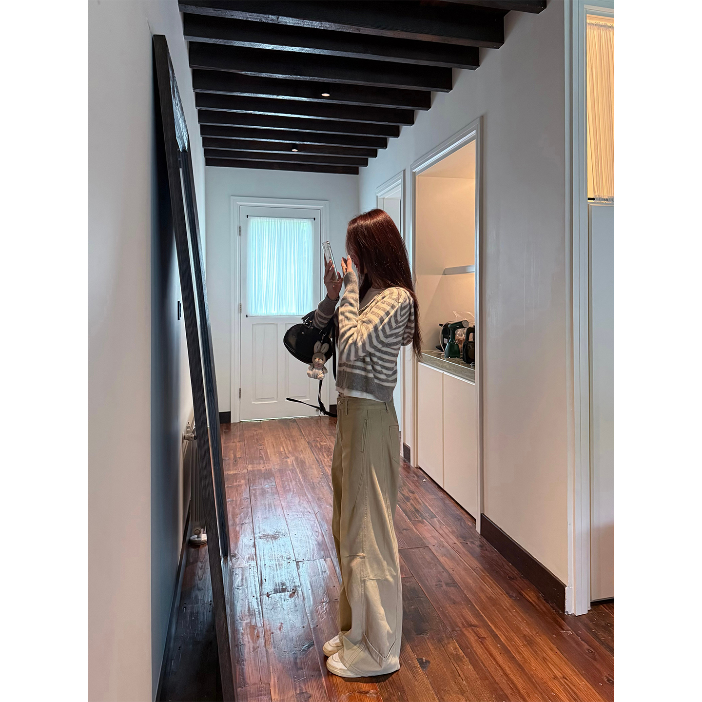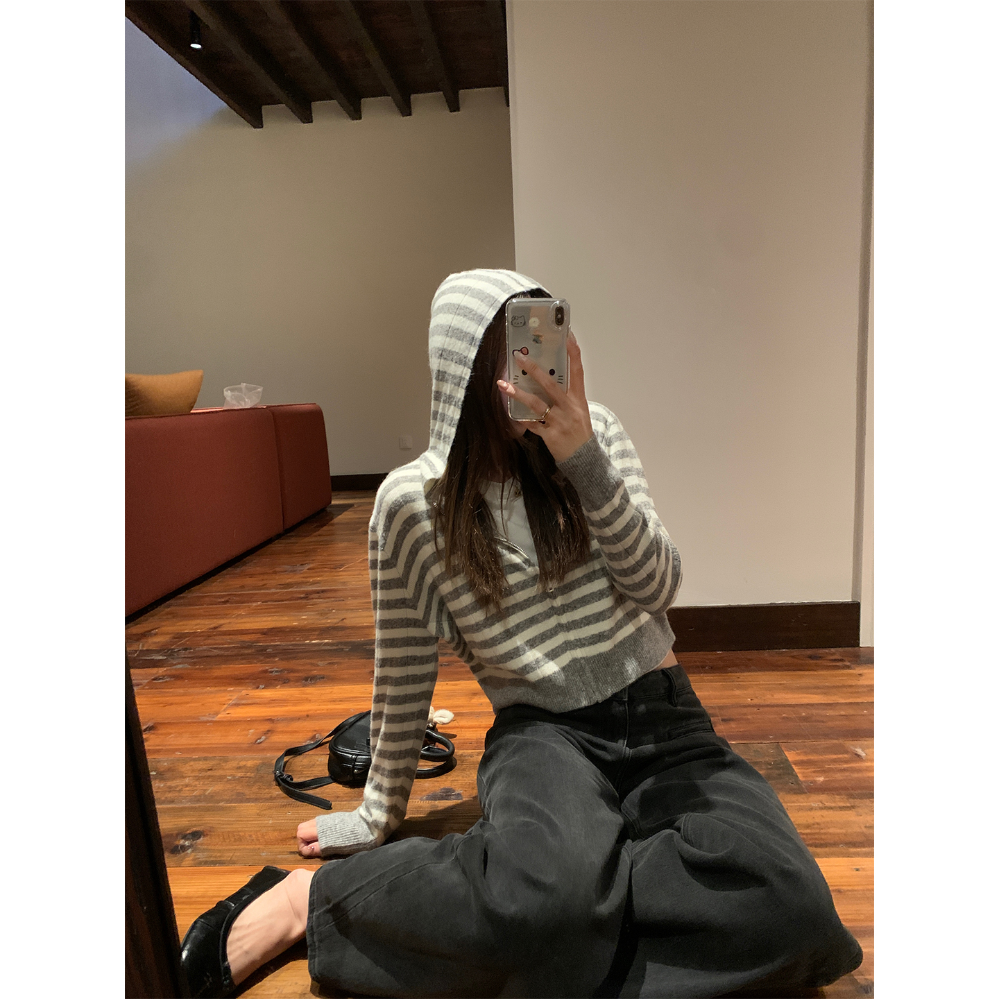 Cactishop留学生 灰条纹连帽毛衣女韩系休闲长袖拉链短款针织开衫