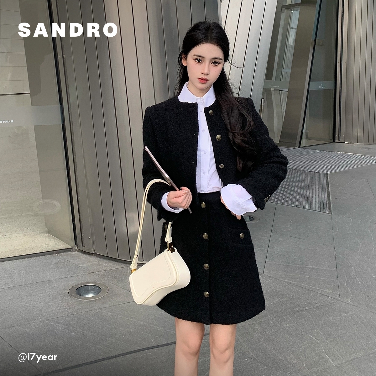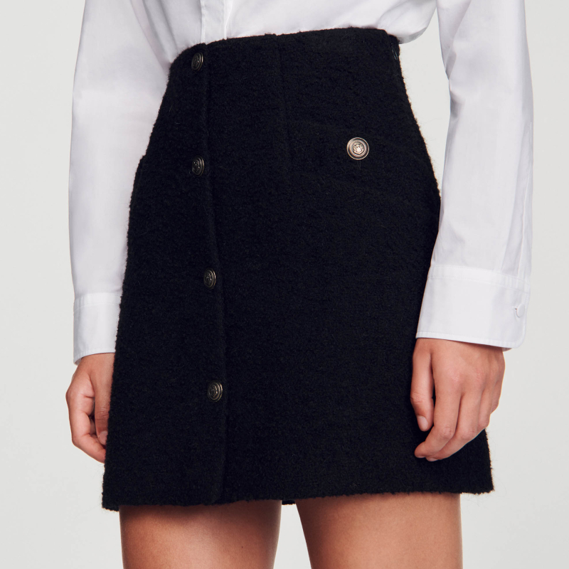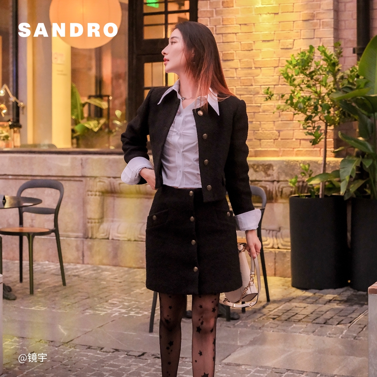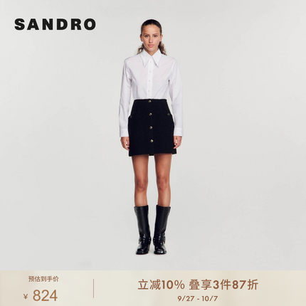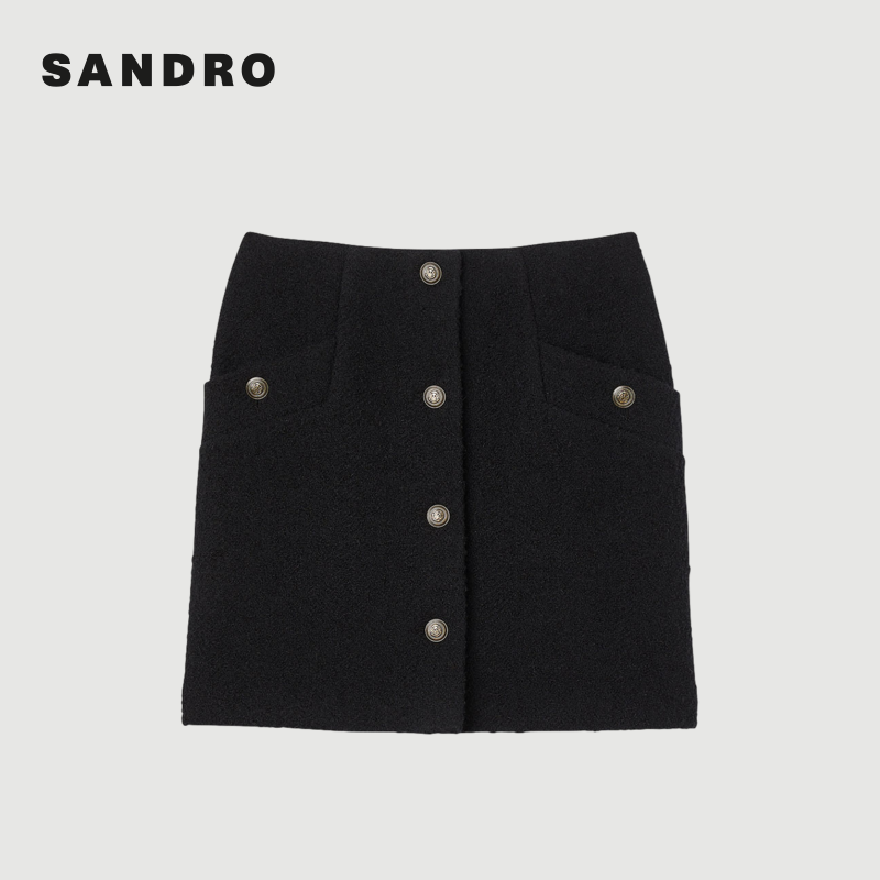 SANDRO Outlets秋冬女装法式气质时尚黑色A字型短款花呢半身裙