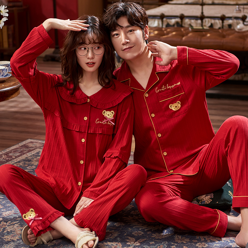 现货速发100%棉结婚睡衣情侣春长袖新婚喜庆枣红色家居服男套装