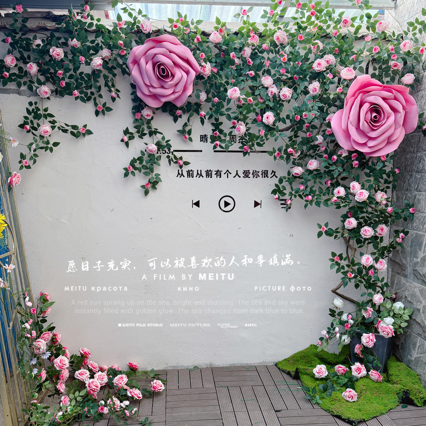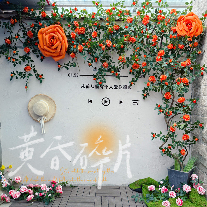 仿真玫瑰花藤网红拍照打卡背景墙晴天粉色墙景区民宿门店阳台装饰