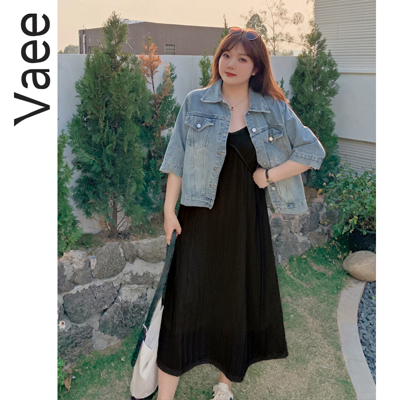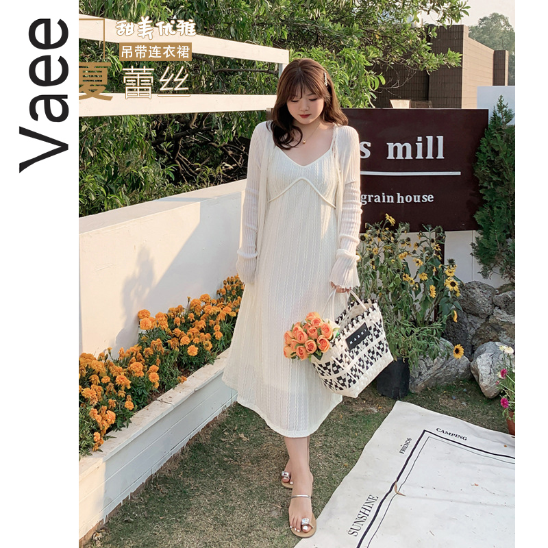 Vaee大码女装2024夏季新款韩版连衣裙胖妹妹V领钩花甜美吊带裙