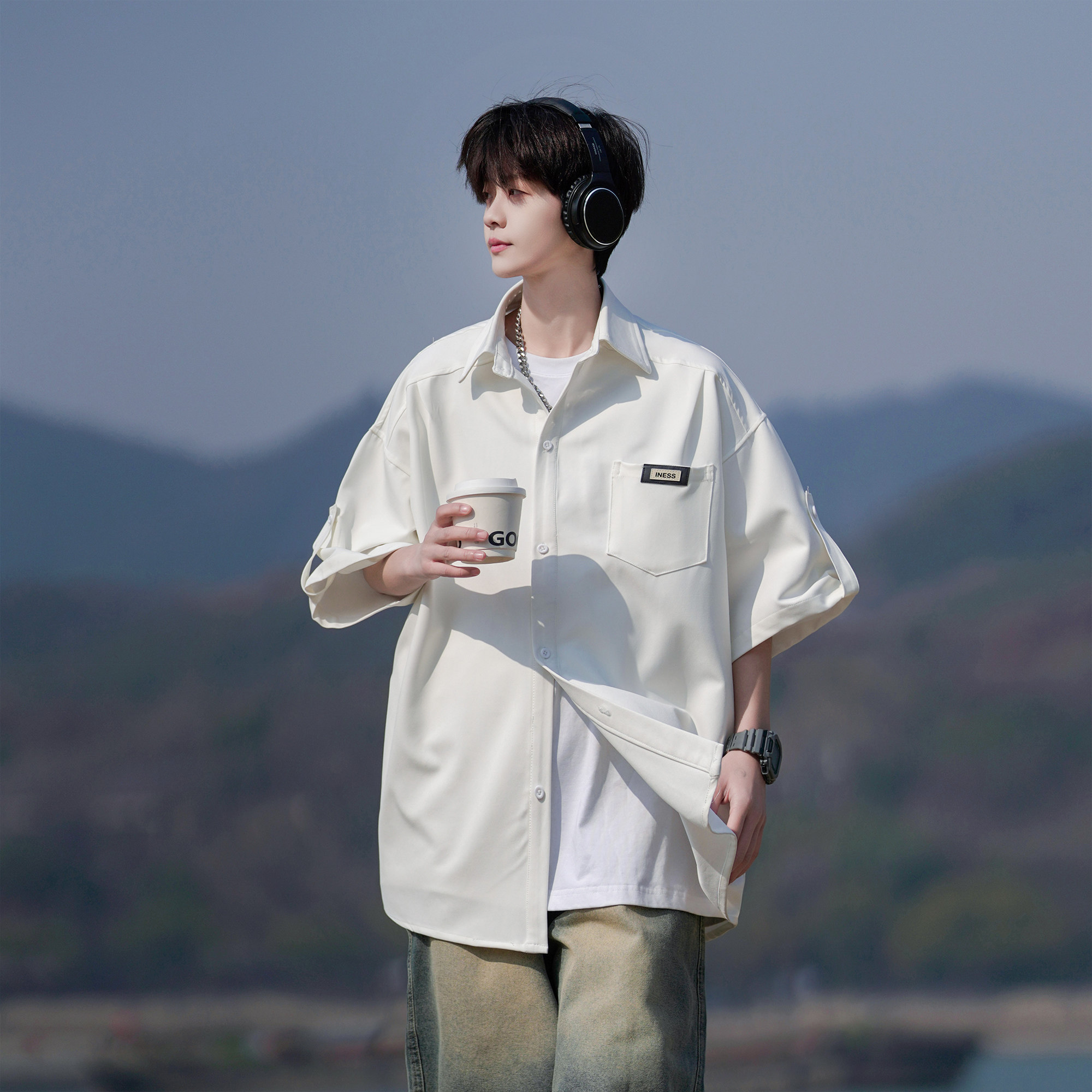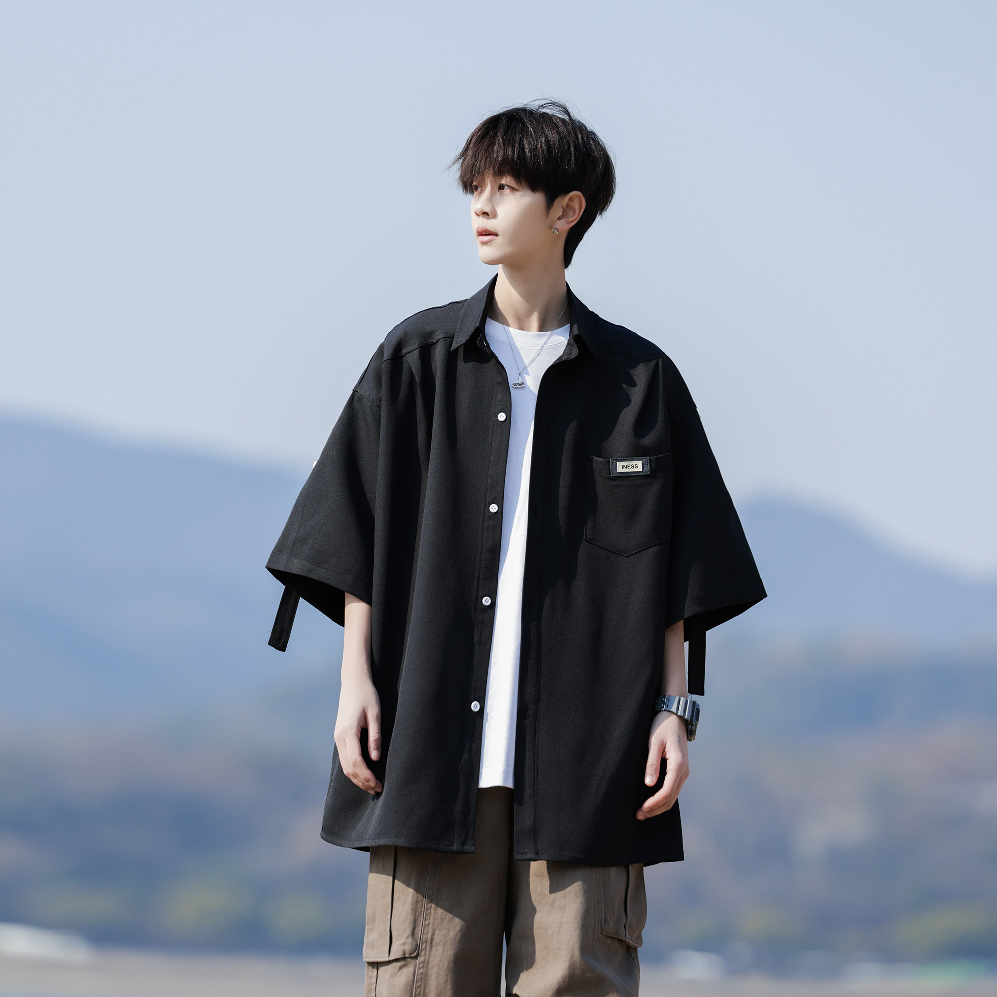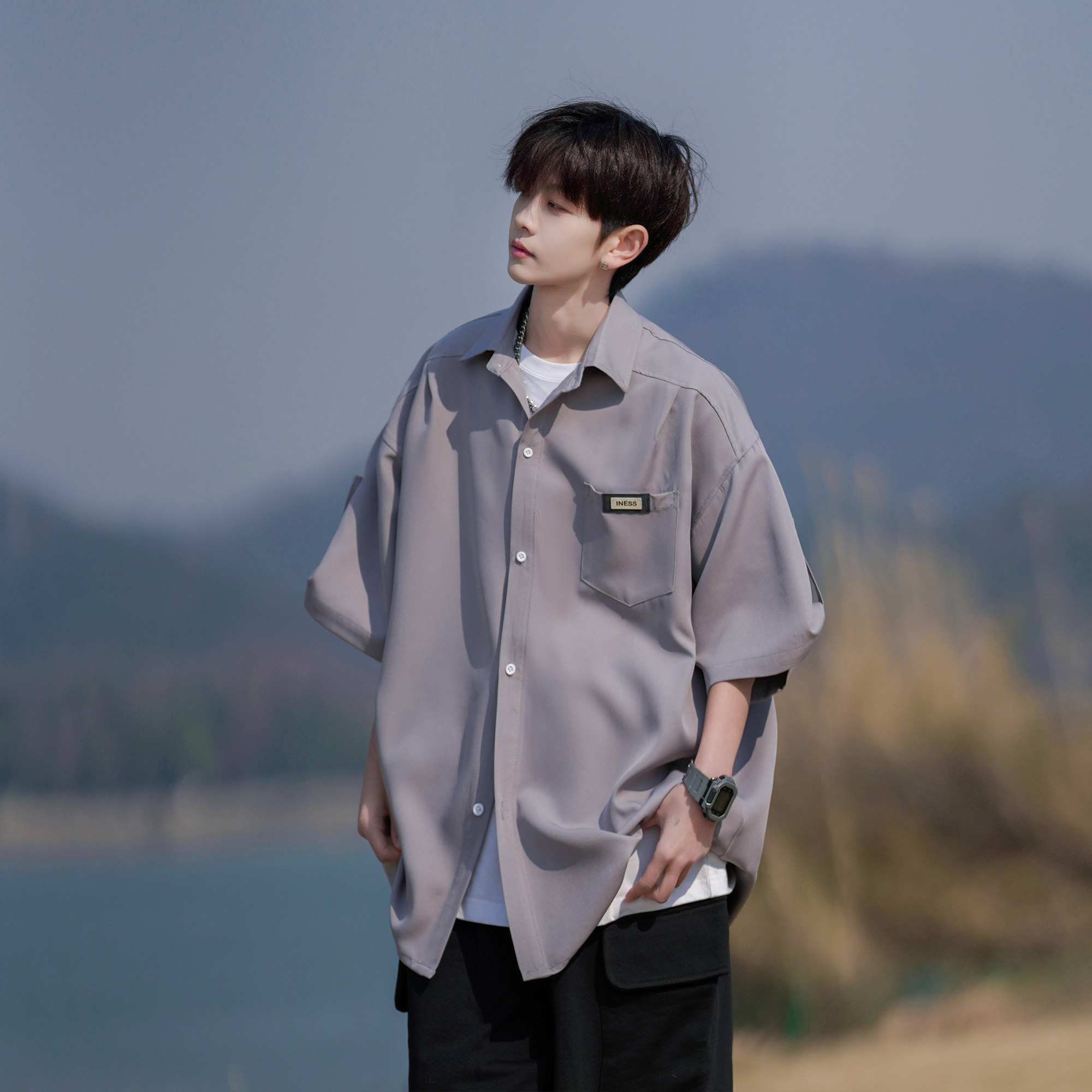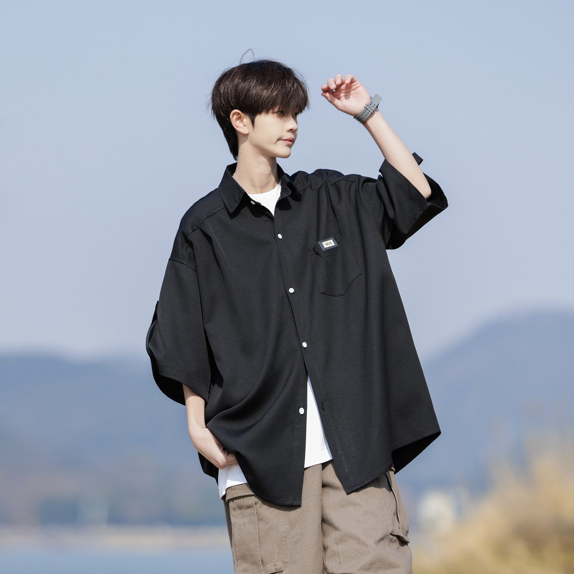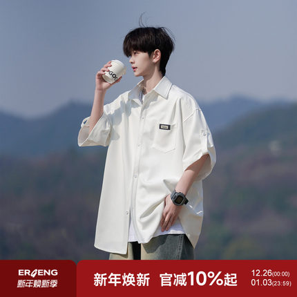 二更 冰丝短袖衬衫男夏季薄款休闲宽松大码男士夏日免烫白色衬衣