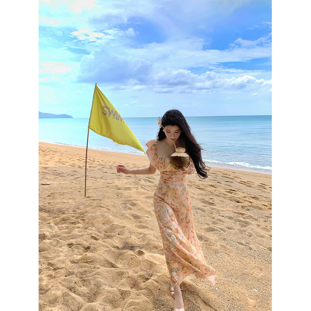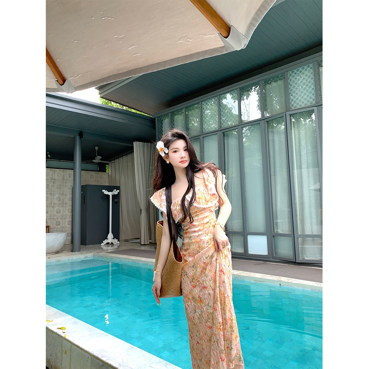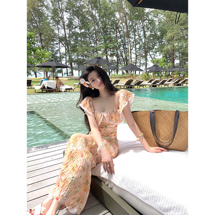 YEXIAOTING叶小婷 橘子气泡水 碎花收腰蕾丝花边连衣裙海边长裙女