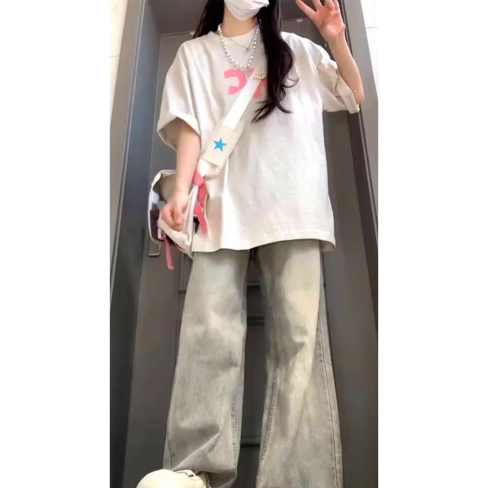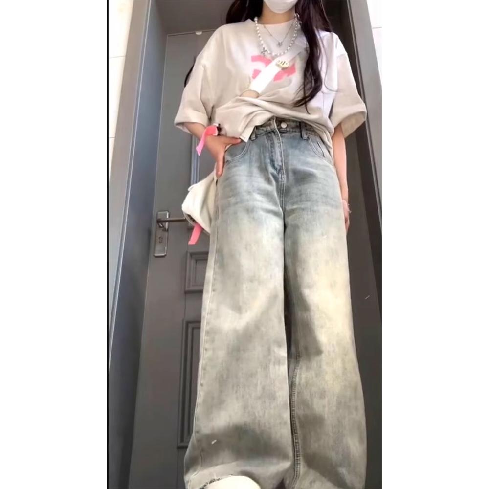 大码美式黄泥色阔腿牛仔裤女秋季胖mm宽松高腰显瘦直筒微喇叭长裤