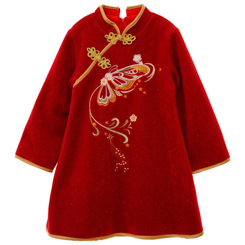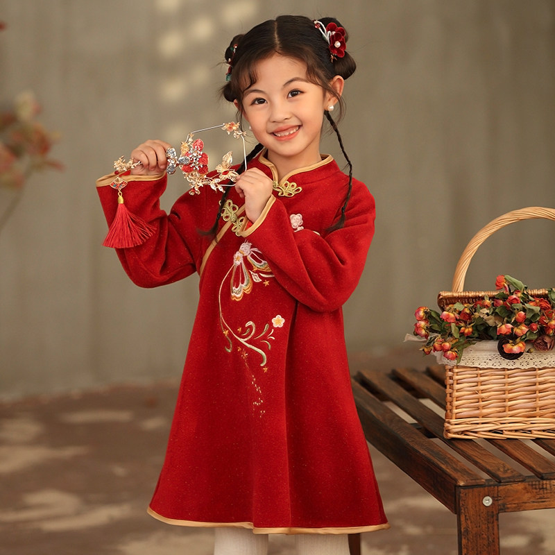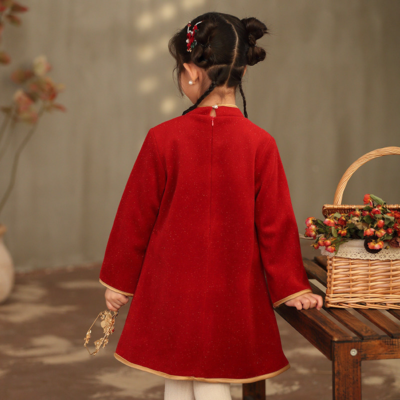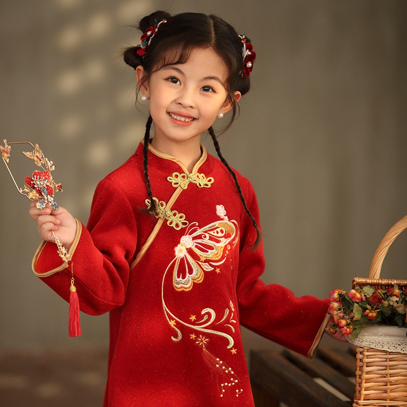 女童2025秋冬新款洋气中大童中国风公主裙红色旗袍拜年加绒连衣裙