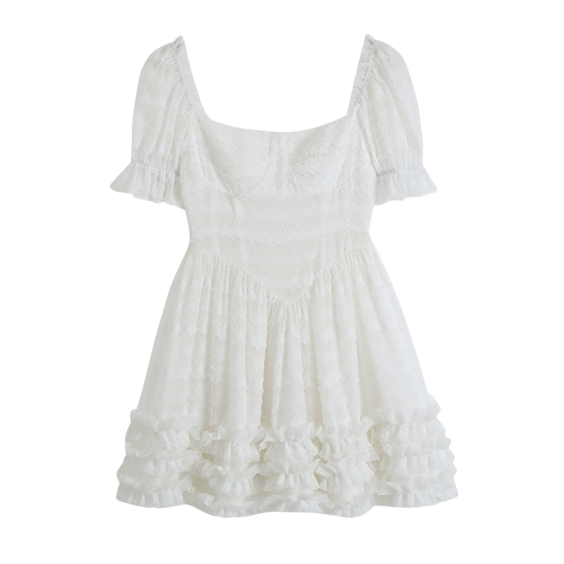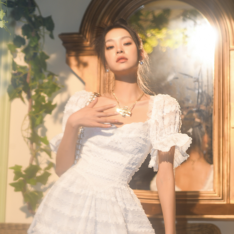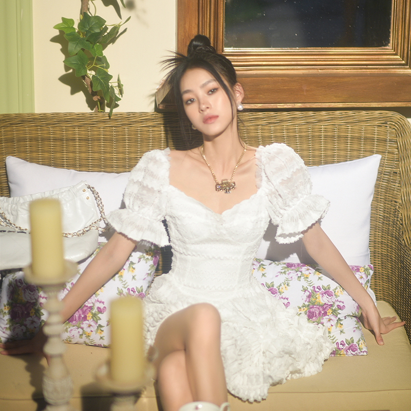 can方领一字肩短袖荷叶边bm宫廷风白色连衣裙短裙女