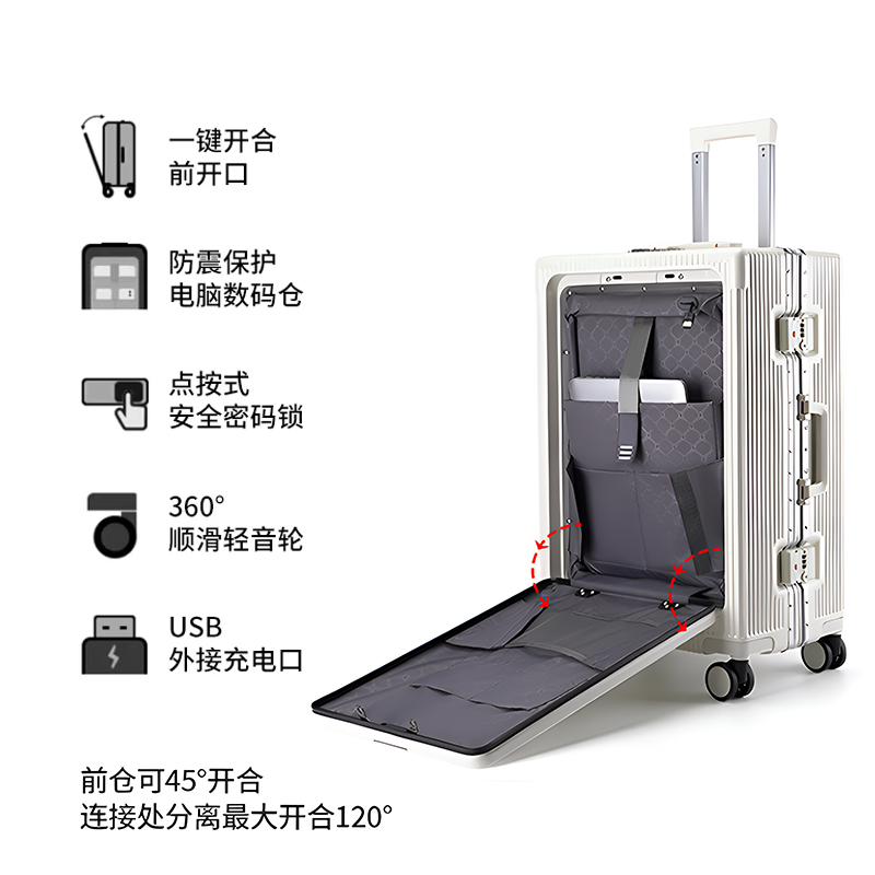 前置开口行李箱铝框结实耐用大容量USB充电杯架旅拉杆密码登机侧