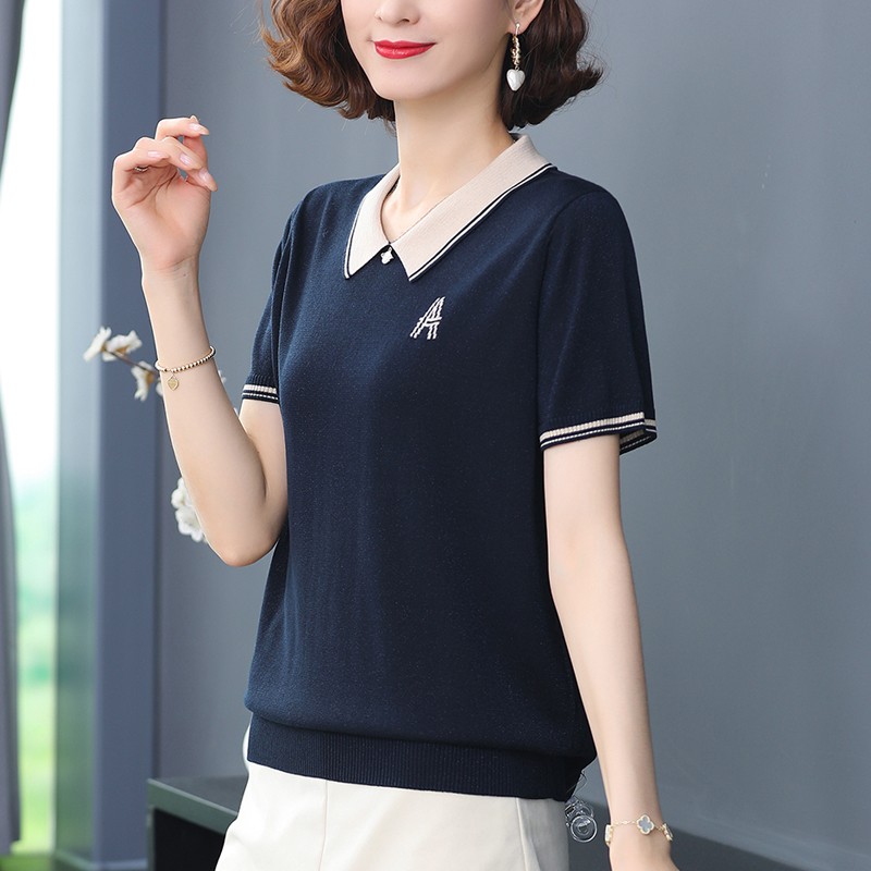 夏季妈妈桑蚕丝短袖t恤宽松上衣中年女士翻领薄款针织衫加肥加大