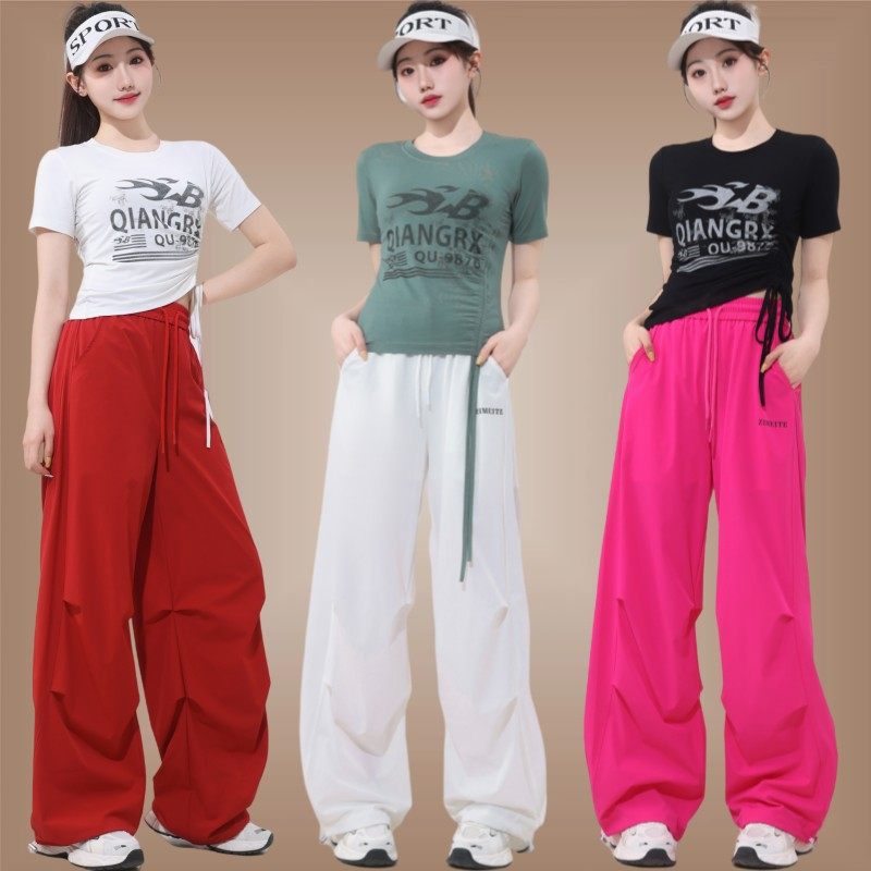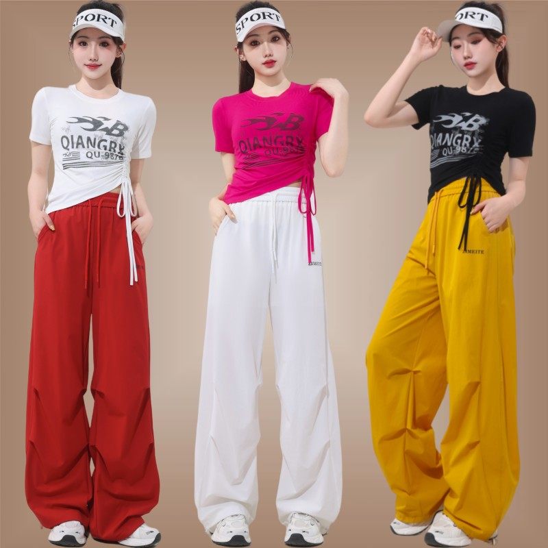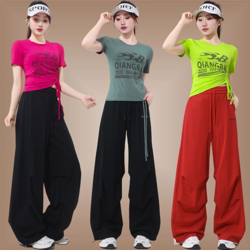 广场舞曳步舞服装新款抽绳短袖t恤女跳舞伞兵裤子爵士舞衣服套装