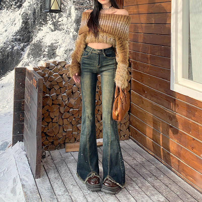 开叉直筒微喇牛仔裤女秋冬2025年新款高腰显瘦弹力复古毛边喇叭裤