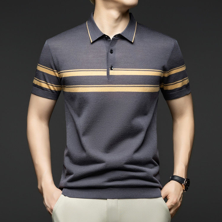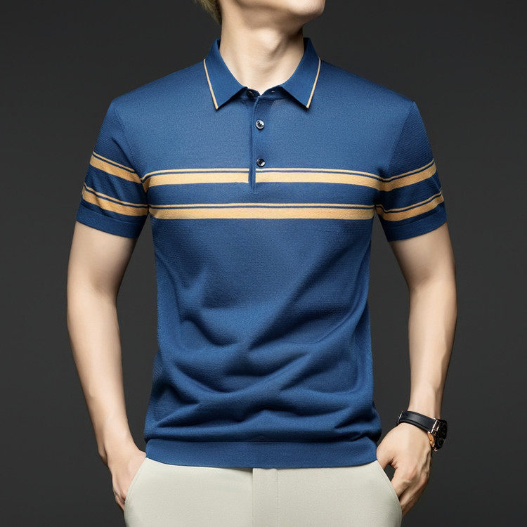 2025夏季男士中年伊力特针织短袖T恤条纹色织半袖polo衫体恤衫