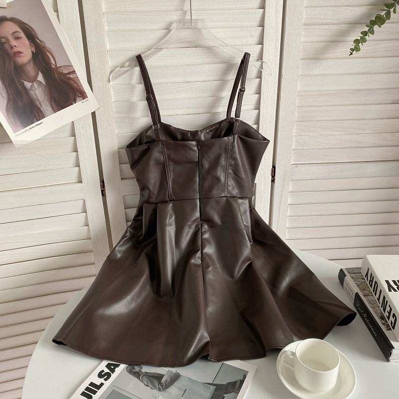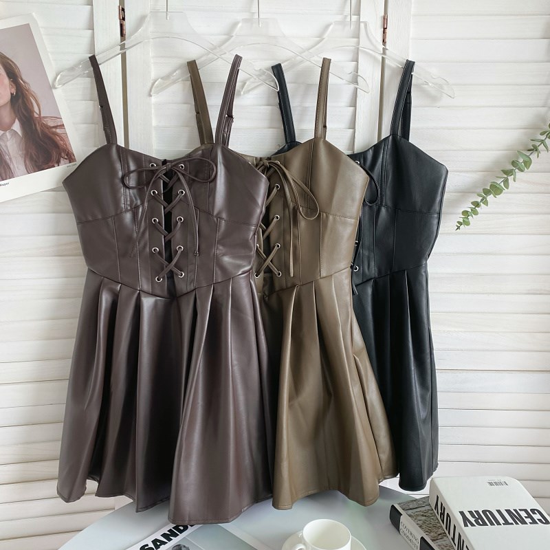 交叉系带无袖PU皮吊带裙女2023秋季性感百搭高腰A字连衣裙短裙