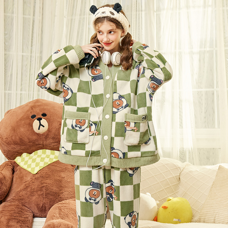 芬腾布朗熊睡衣女珊瑚绒秋冬季加绒加厚保暖套装法兰绒女款家居服