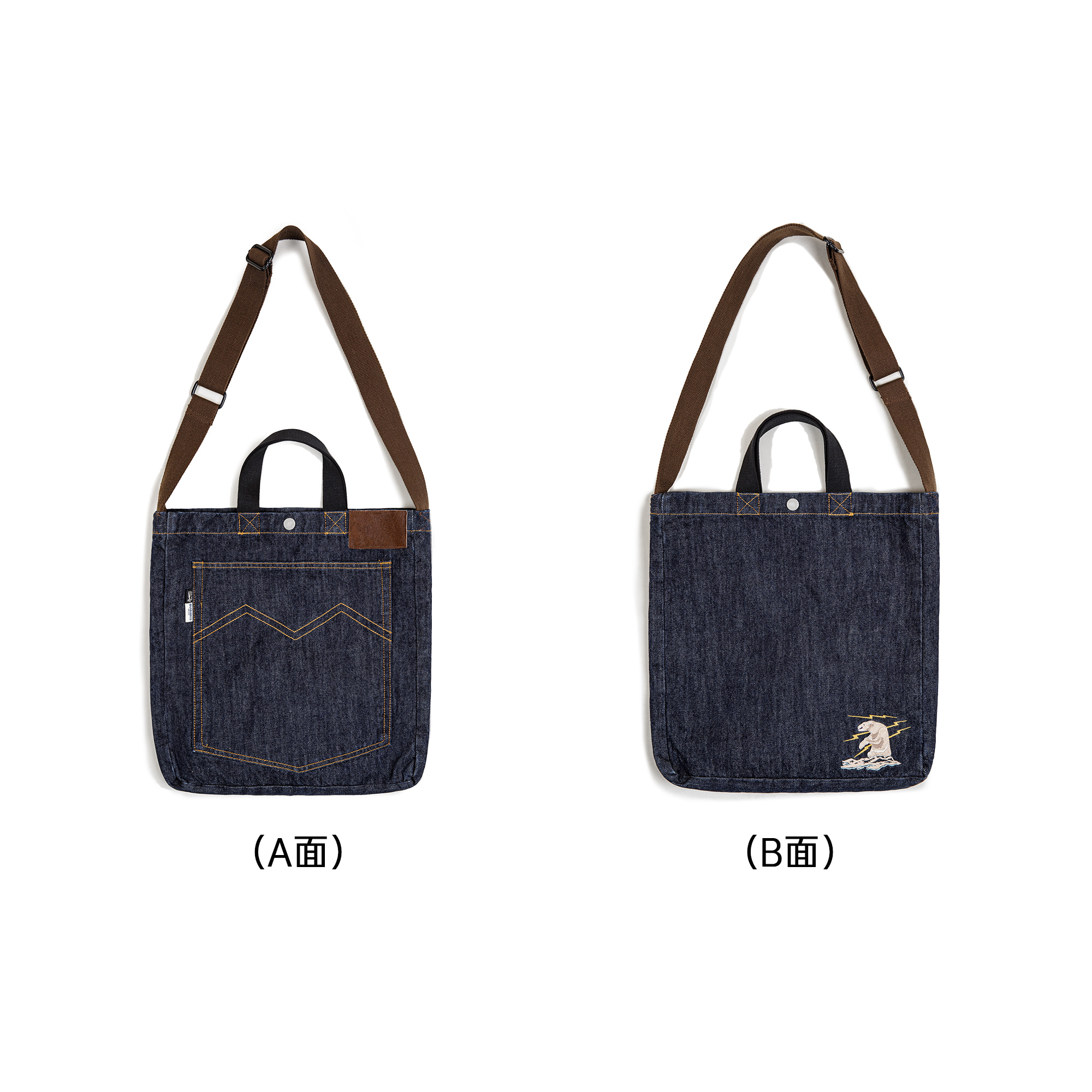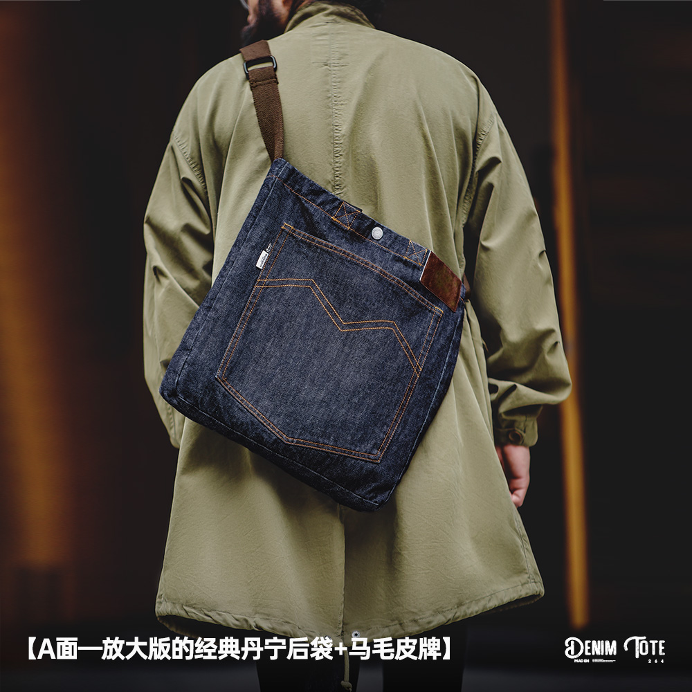 马登工装美式复古牛仔单肩斜挎包丹宁刺绣大容量手提平板托特包男