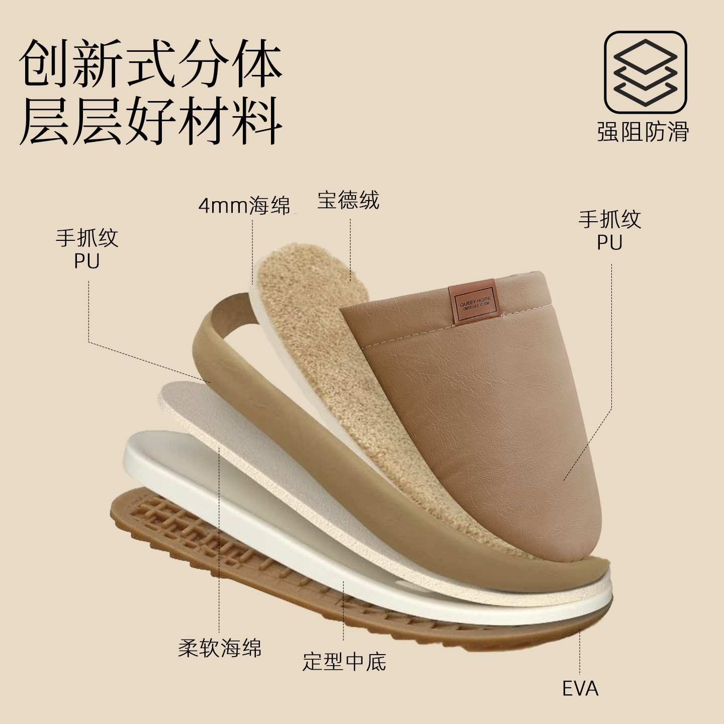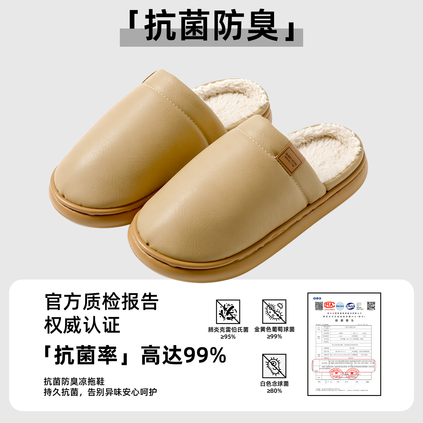 防水棉拖鞋女冬季室内加绒保暖家居家防滑防臭抑菌PU皮拖男秋冬天