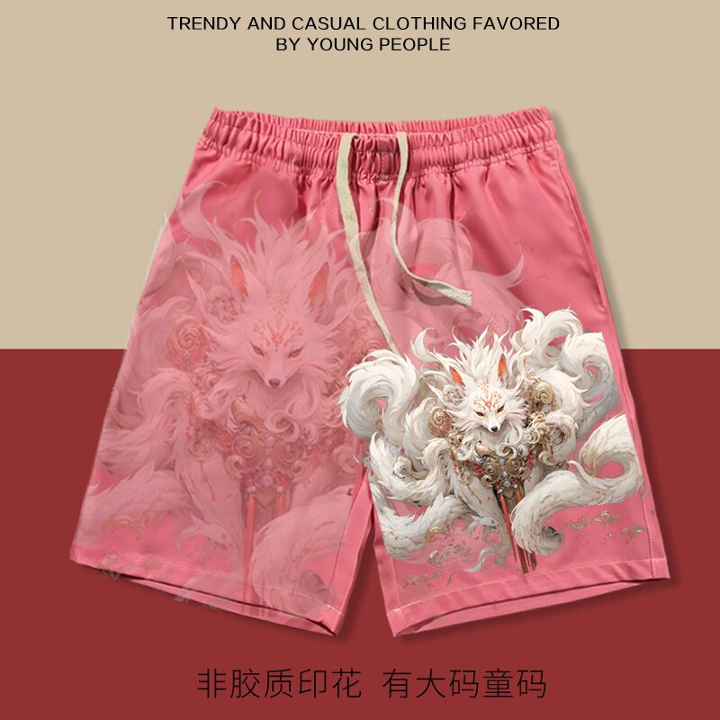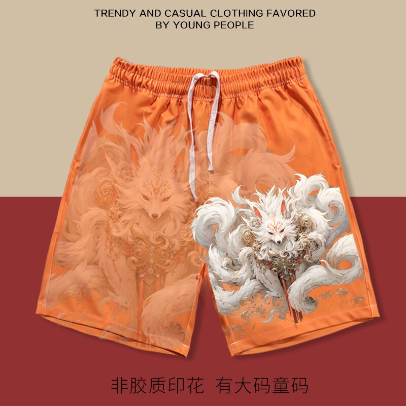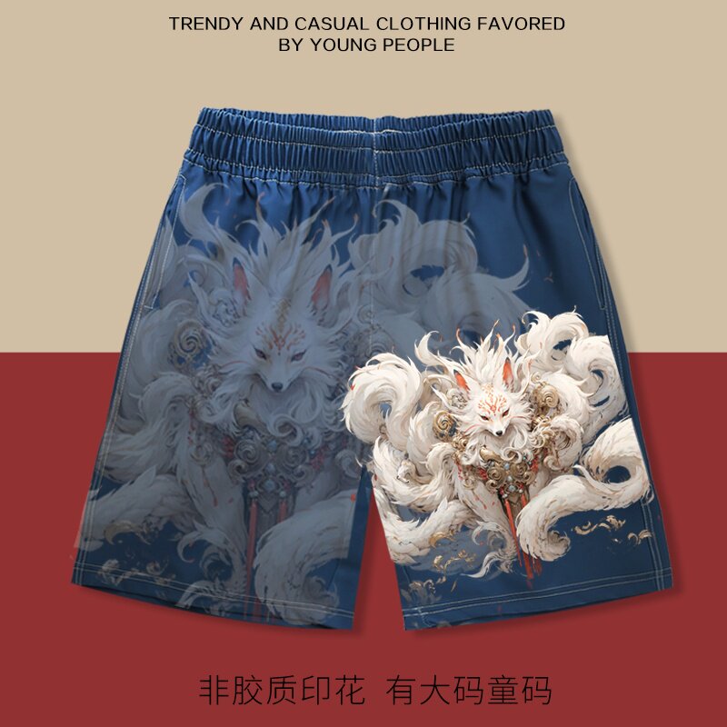 山海经九尾狐国潮短裤男夏季宽松直筒五分裤男女沙滩裤有大码国风