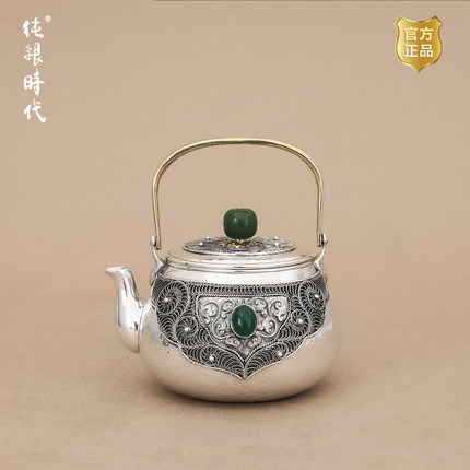 纯银时代 铜提梁玉珠泡茶壶纯银999手工宫廷风掐丝镶玉茶壶140ml