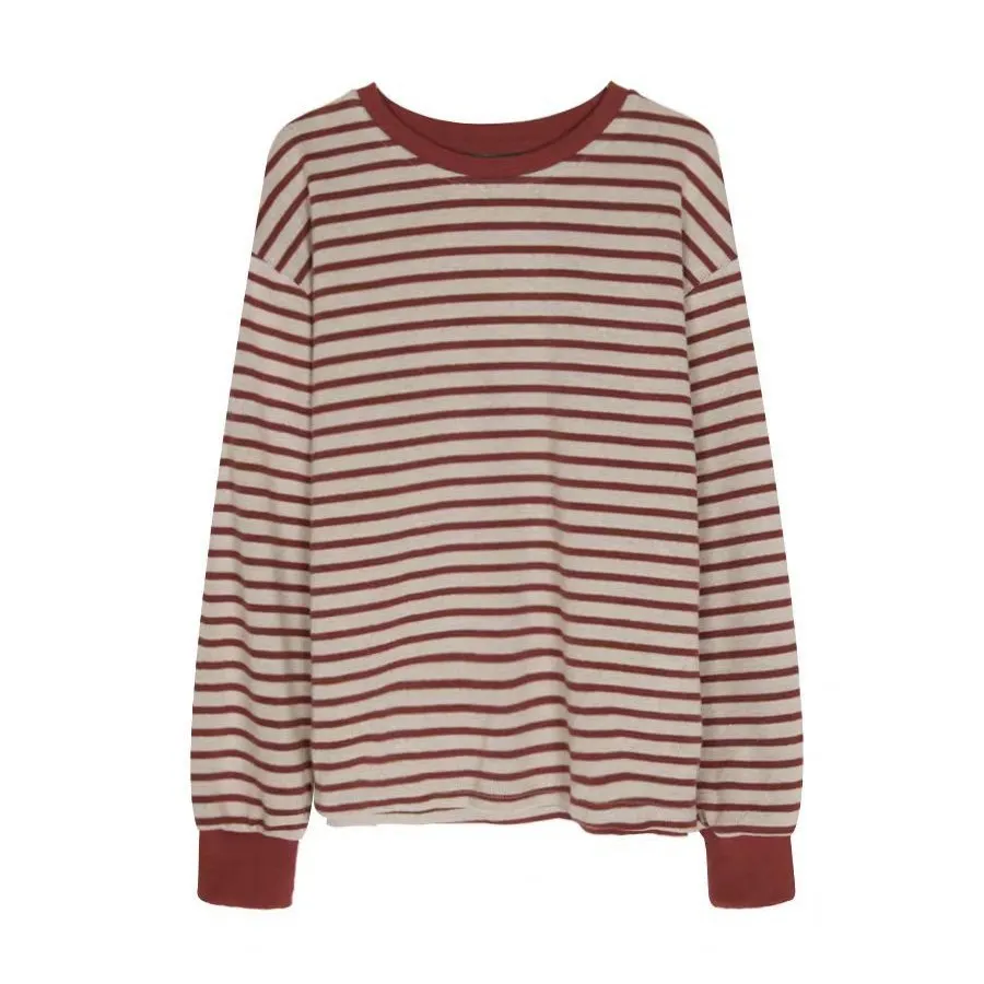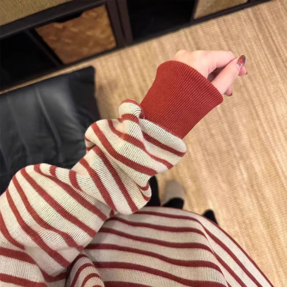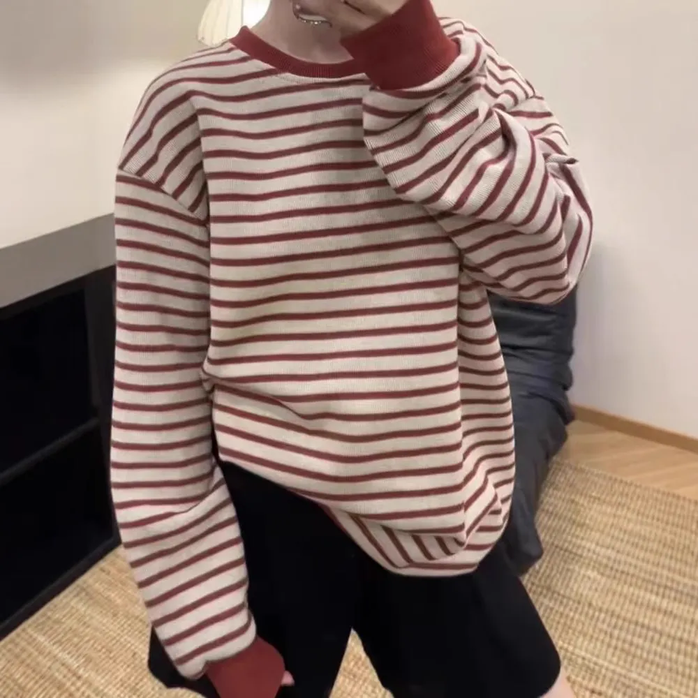 春秋2025年新款红色条纹圆领卫衣女韩系慵懒风宽松打底衫长袖上衣