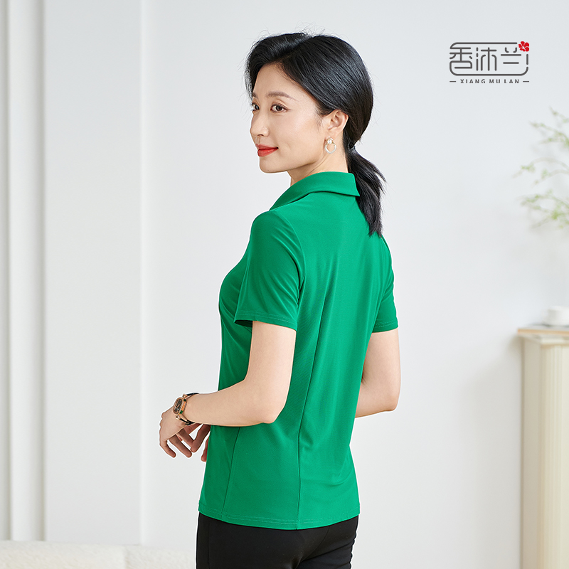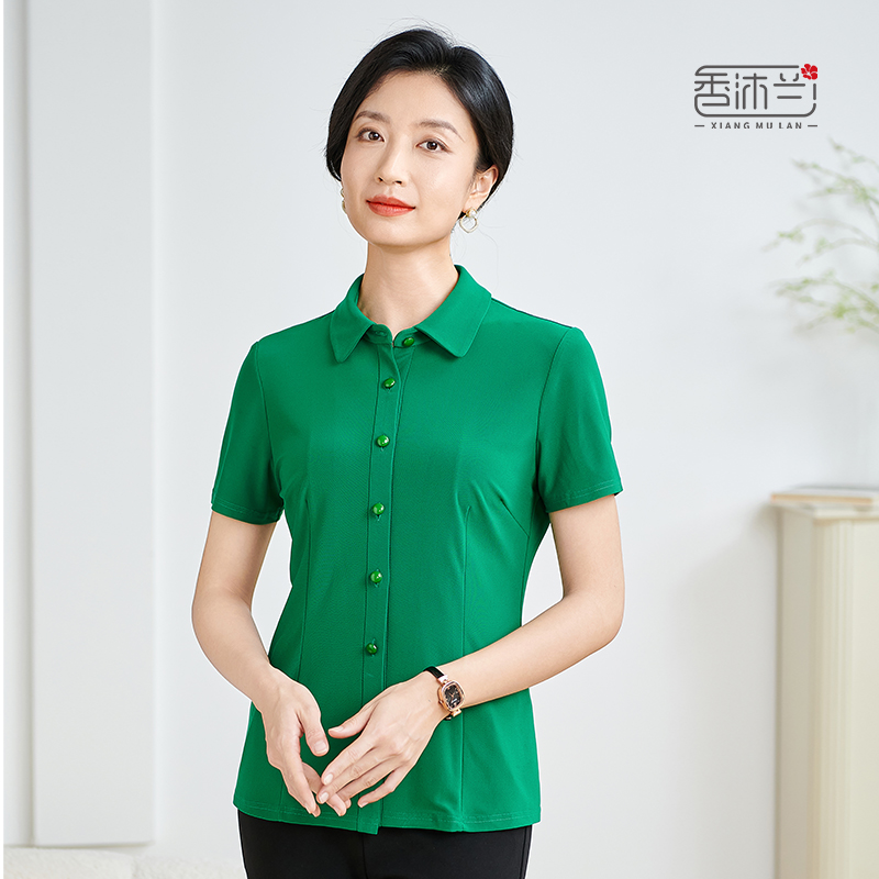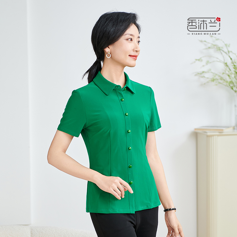 【香沐兰专柜款】气质修身妈妈装绿色短袖衬衫女显瘦大码翻领衬衣