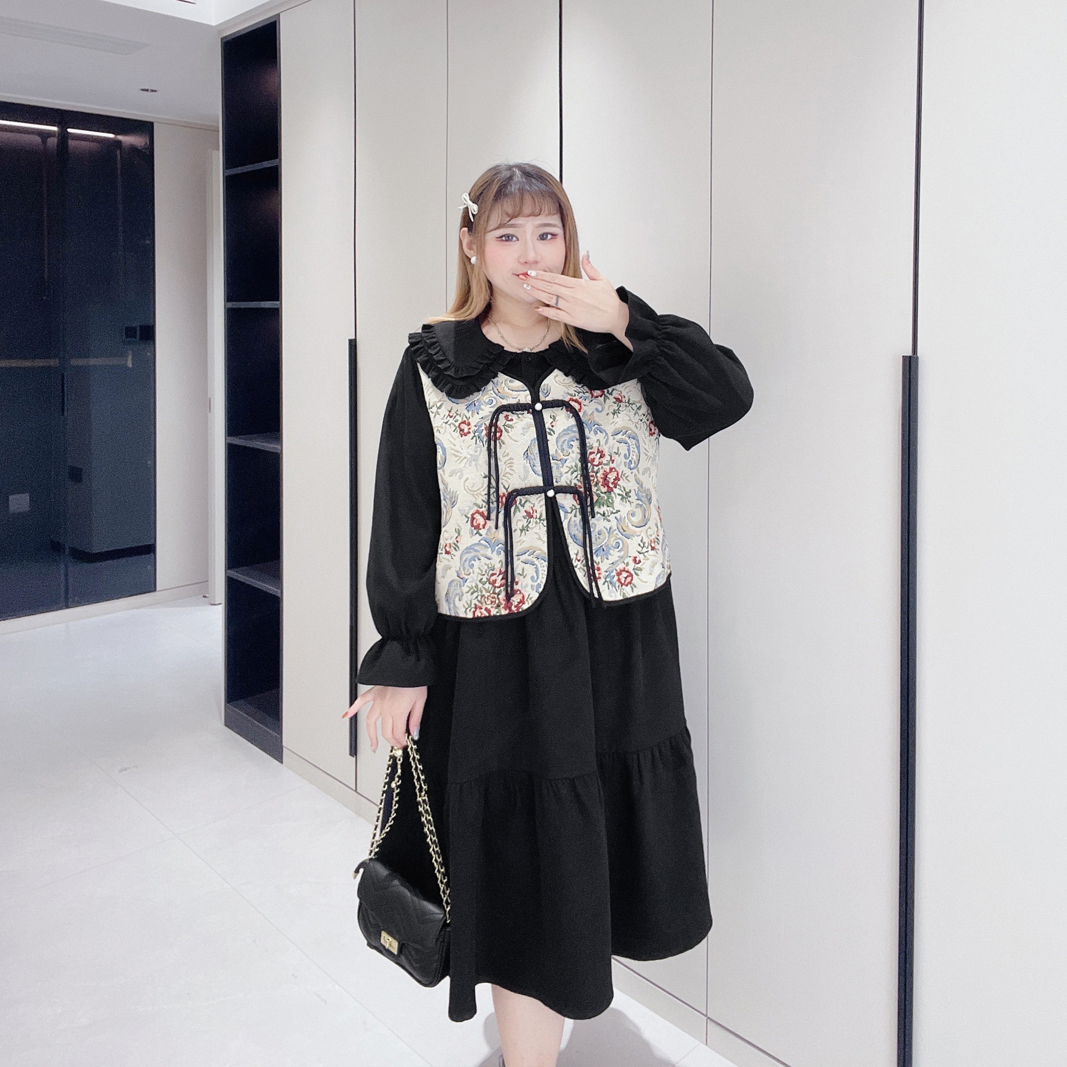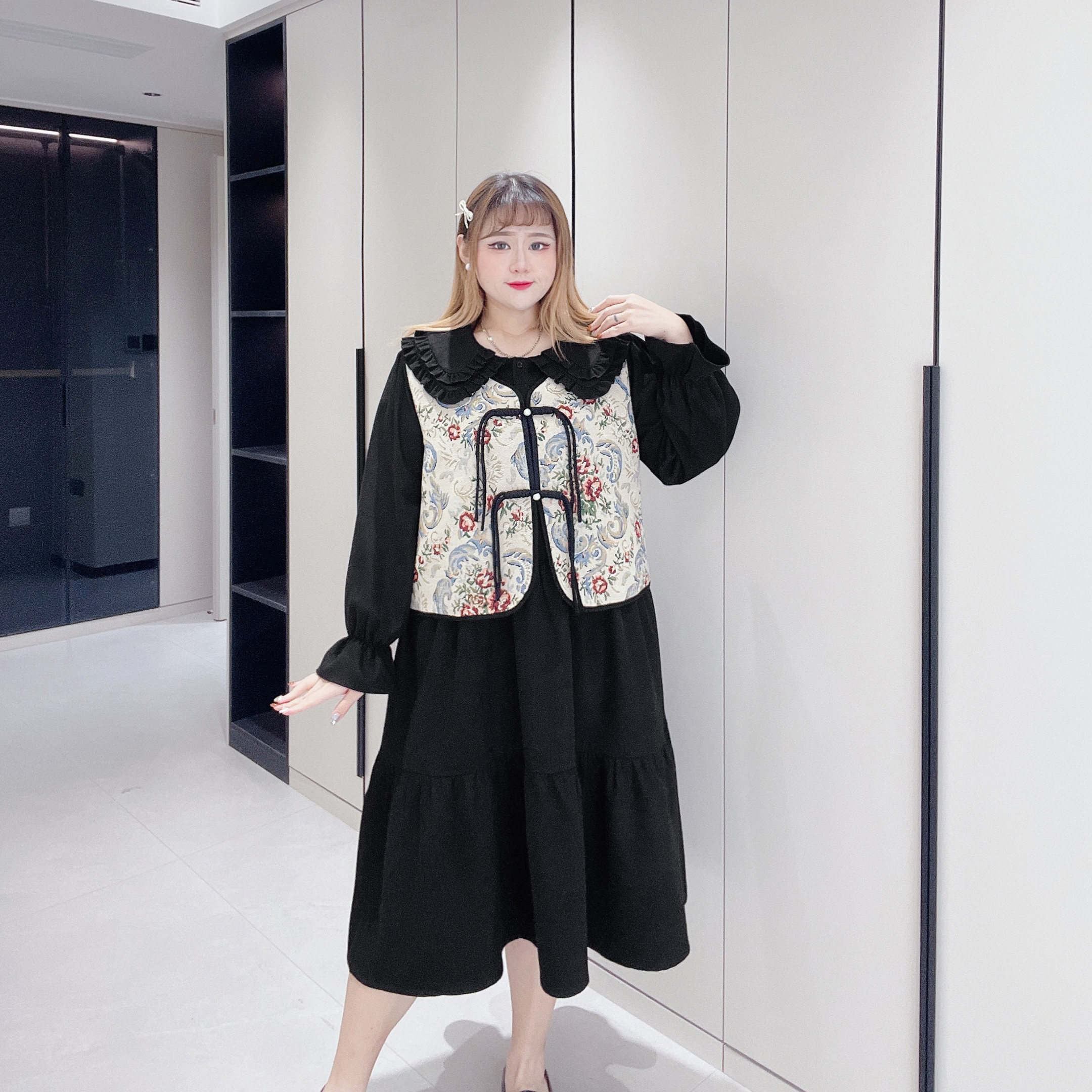 胖莹莹大码女装2026春款胖MM复古国风马甲娃娃领减龄连衣裙两件套