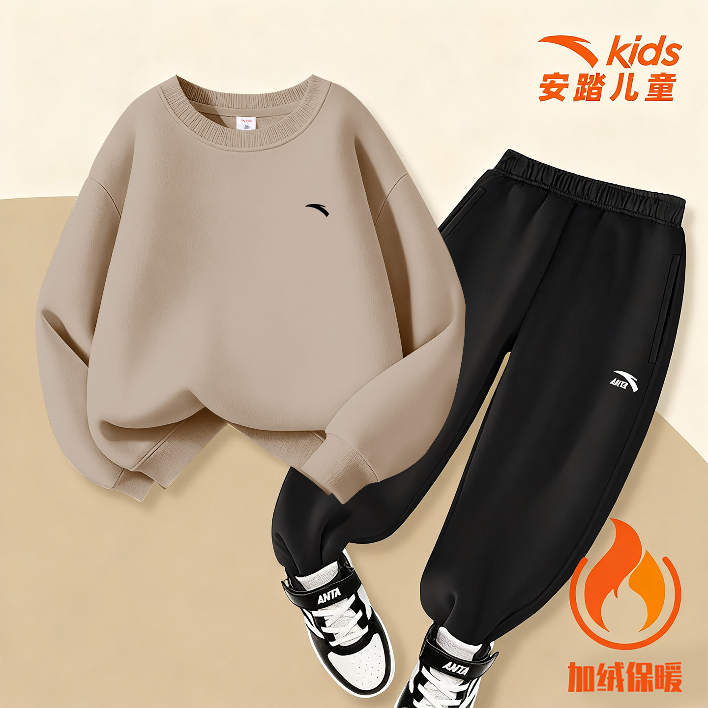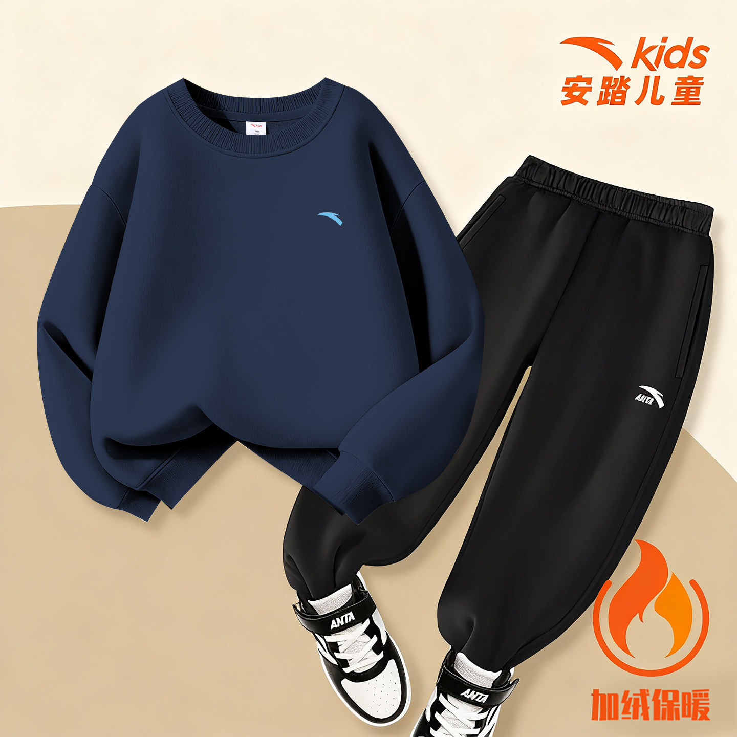 安踏儿童加绒卫衣套装男童2026新款秋冬装加绒加厚长袖长裤两件套