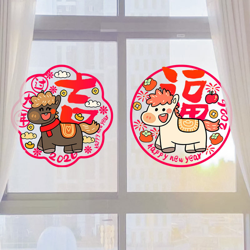 2026新年装饰玻璃门贴纸布置卡通马年窗花春节福字氛围布置静电贴
