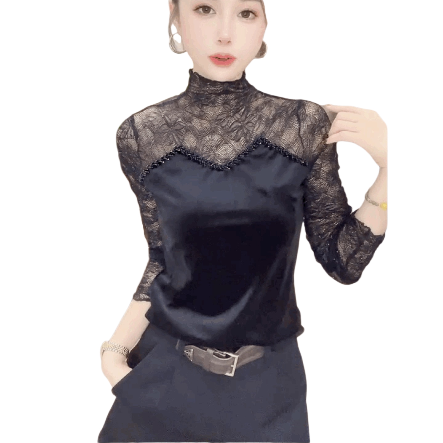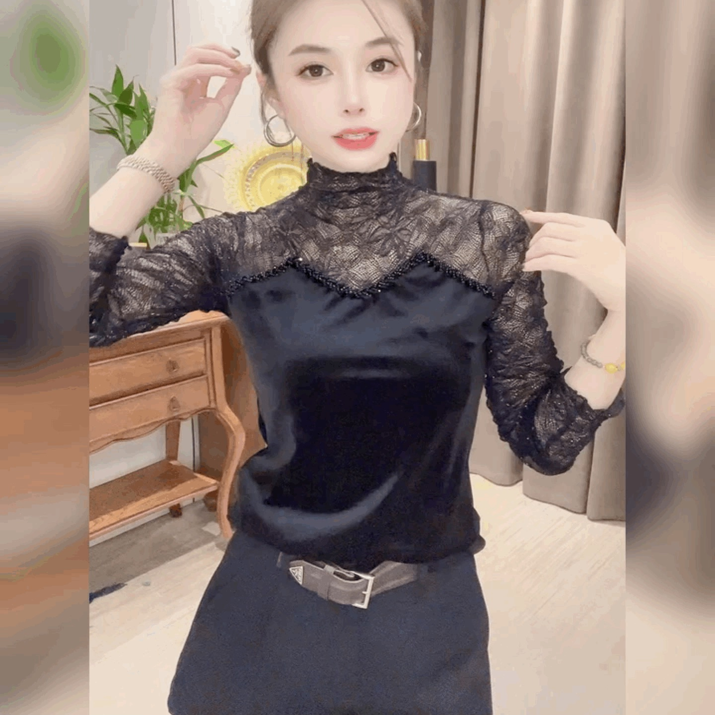 钉珠长袖黑色法式丝绒上衣女气质半高领T恤蕾丝拼接金丝绒打底衫