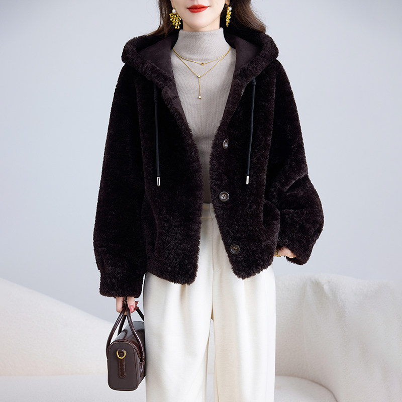 卡若维娅2025新款海宁颗粒绒皮草外套女短款连帽仿羊羔毛大衣冬
