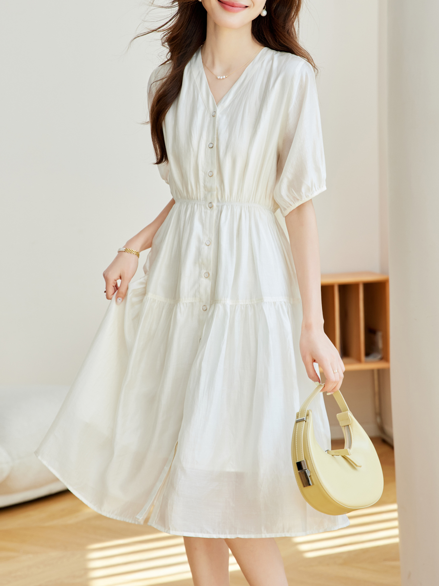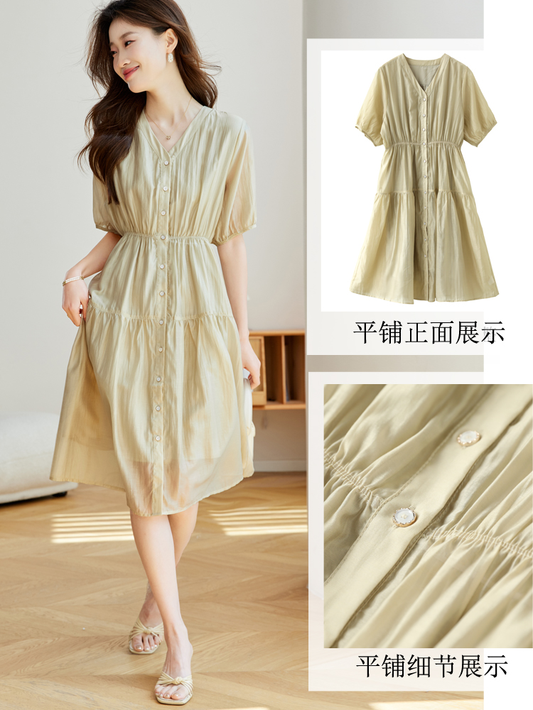 2024夏季新款A字显瘦短袖中长款连衣裙气质V领温柔风垂感裙子女薄