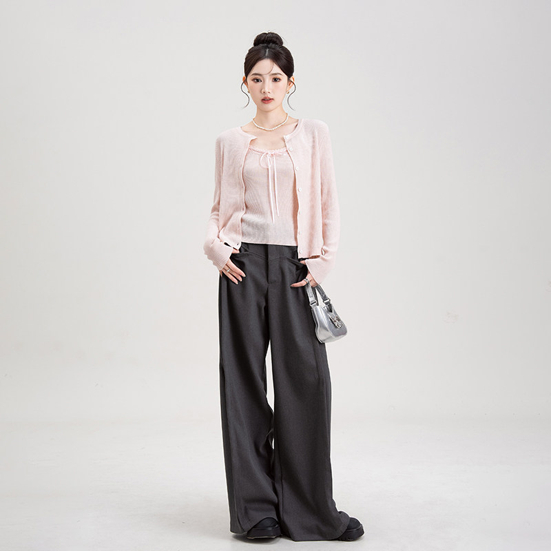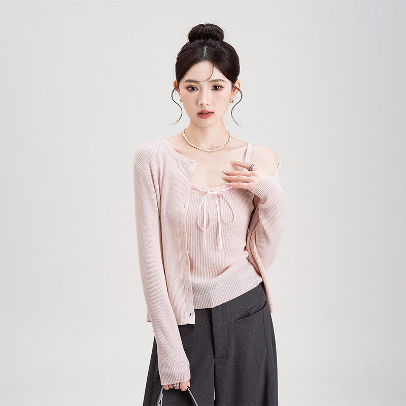 妮茨维浅粉色圆领长袖针织开衫春季新款女装蕾丝吊带背心两件套装
