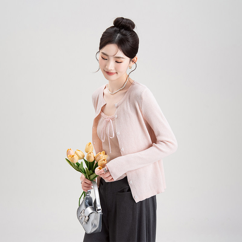 浅粉色圆领长袖针织开衫蕾丝吊带