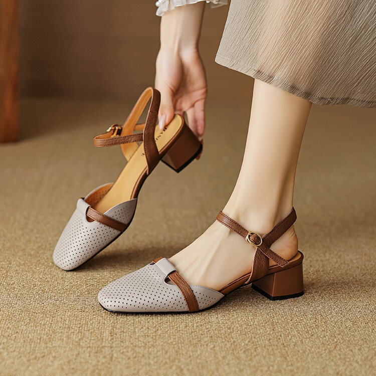 巨好穿法式包头凉鞋女夏方头中跟粗跟真皮镂空米白色40大码41灰色
