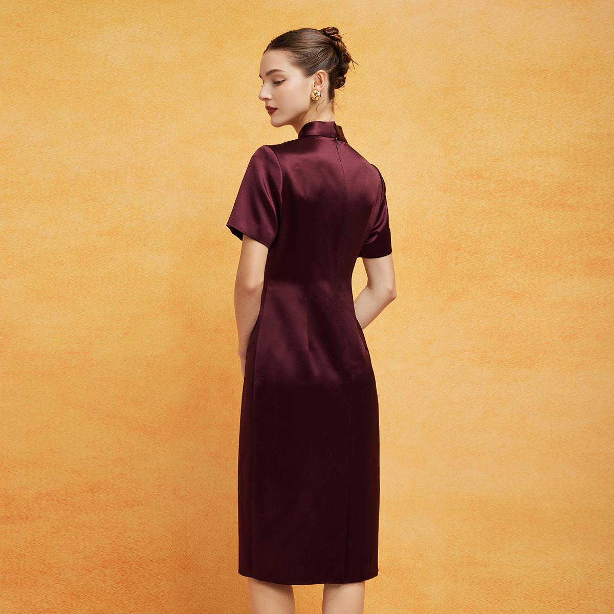 斯尔丽2024新款醋酸面料改良旗袍版精致烫钻工艺短袖修身连衣裙